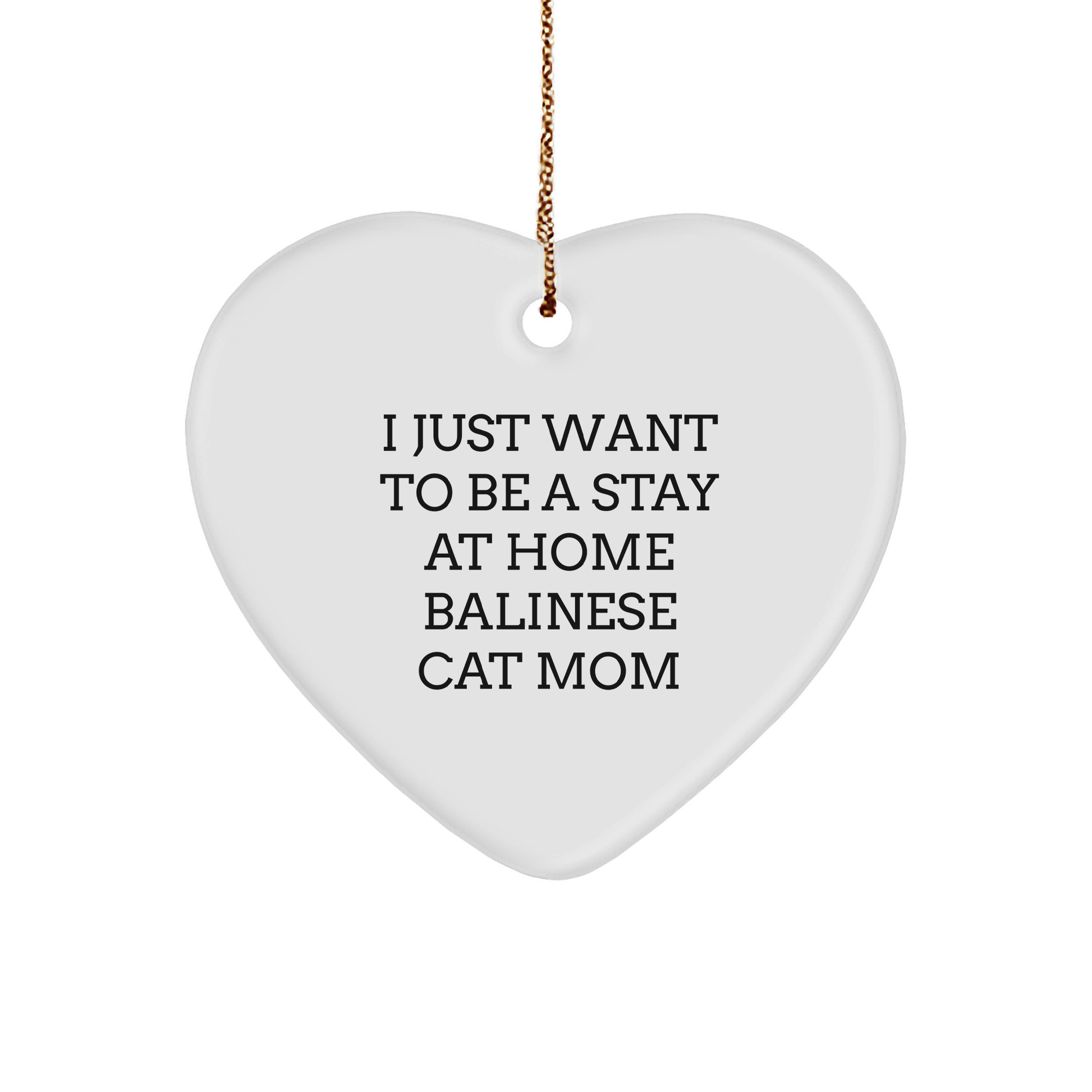 - This heart-shaped ornament is the ideal gift for any Balinese Cat mom or dad, featuring the quote 'I Just Want To Be A Stay At Home Balinese Cat Mom' printed on it. Made from sturdy MDF with a high-gloss plastic finish, this ornament is lightweight and resistant to breaking, making it a great choice for households with children or pets.