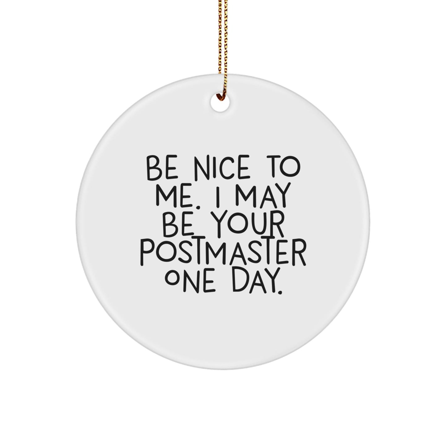 So why should you choose this Circle Ornament? Because it's a thoughtful and unique gift that will be cherished by the Postmaster in your life. It's a reminder to always be kind and respectful, and the funny quote will bring a smile to their face. Plus, it's a great addition to any room, and the festive gold cord makes it easy to hang. So why wait? Get your 'Be Nice to Me' Circle Ornament today and make this Christmas one to remember!