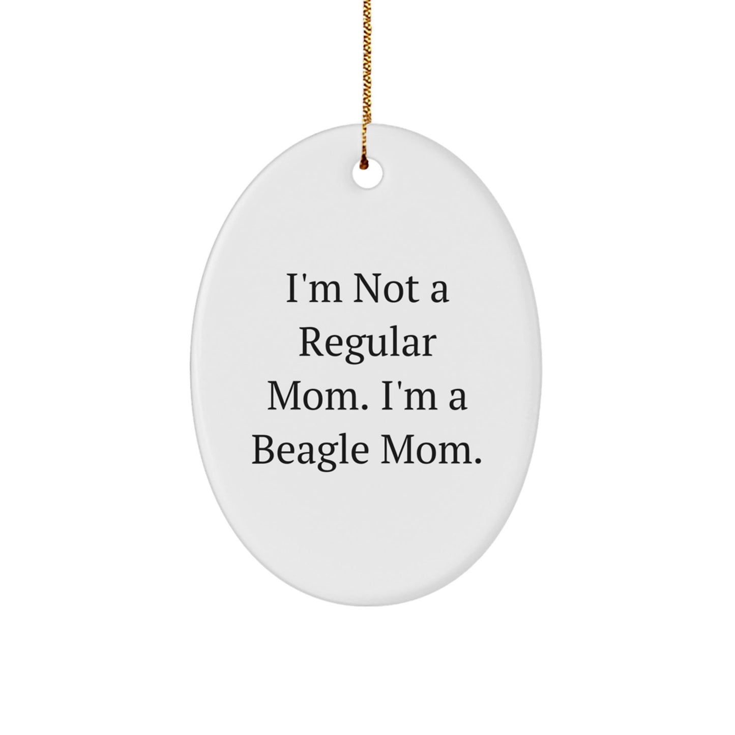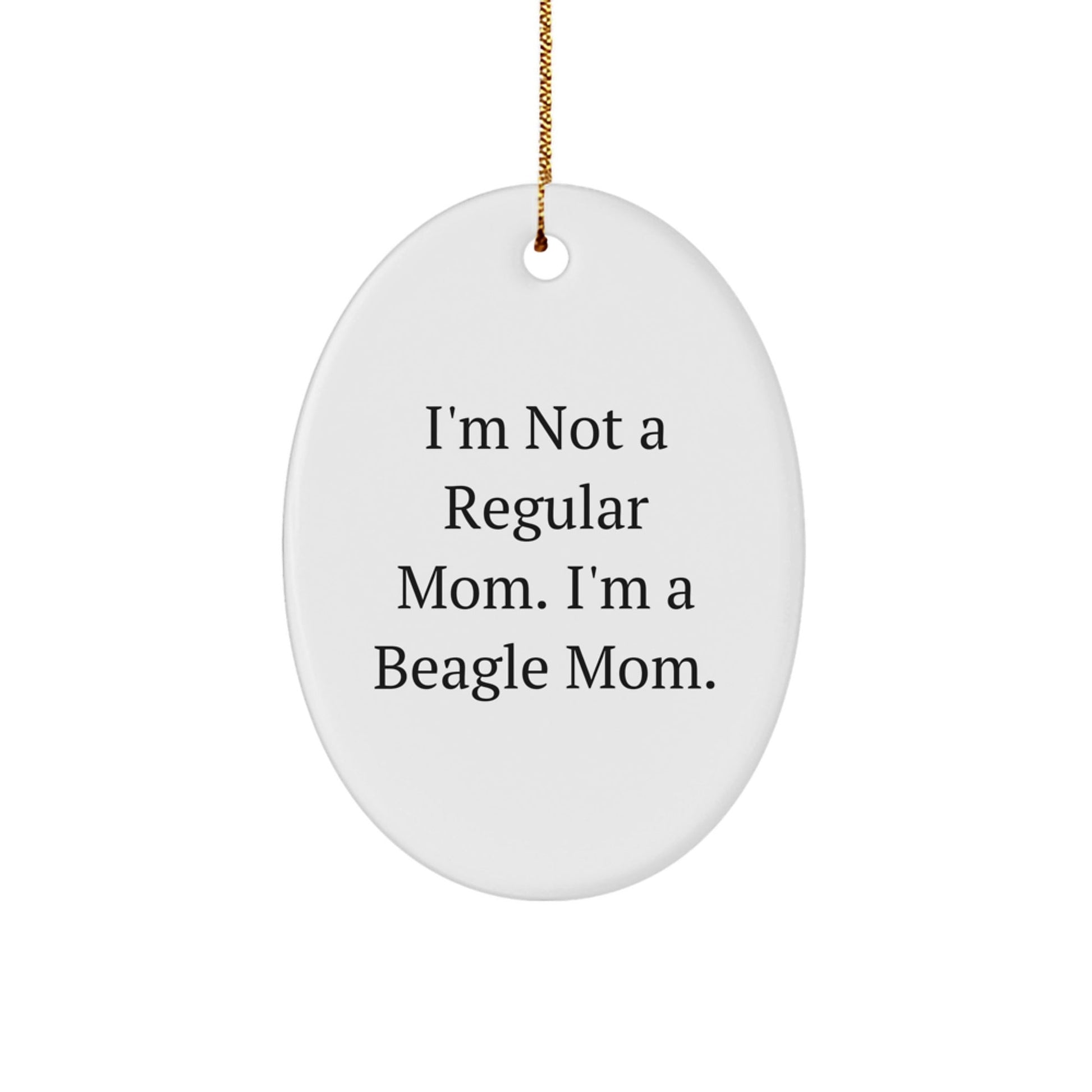 Are you a Beagle mom? Do you love your furry friend? If so, this Oval Ornament is the ideal gift for her! With its funny quote 'I'm Not A Regular Mom. I'm A Beagle Mom.' and vibrant design, it's sure to bring a smile to her face. Made from sturdy MDF with a high-gloss plastic finish, it's lightweight and resistant to breaking, making it a great choice for households with children or pets. The festive gold cord makes it easy to hang, perfect for stress-free decorating. Whether it's for Christmas or any other occasion, this gift is sure to be a hit with any Beagle mom. So why settle for an ordinary gift when you can give her something extraordinary? Get this Beagle mom a unique and thoughtful gift that she'll cherish forever.