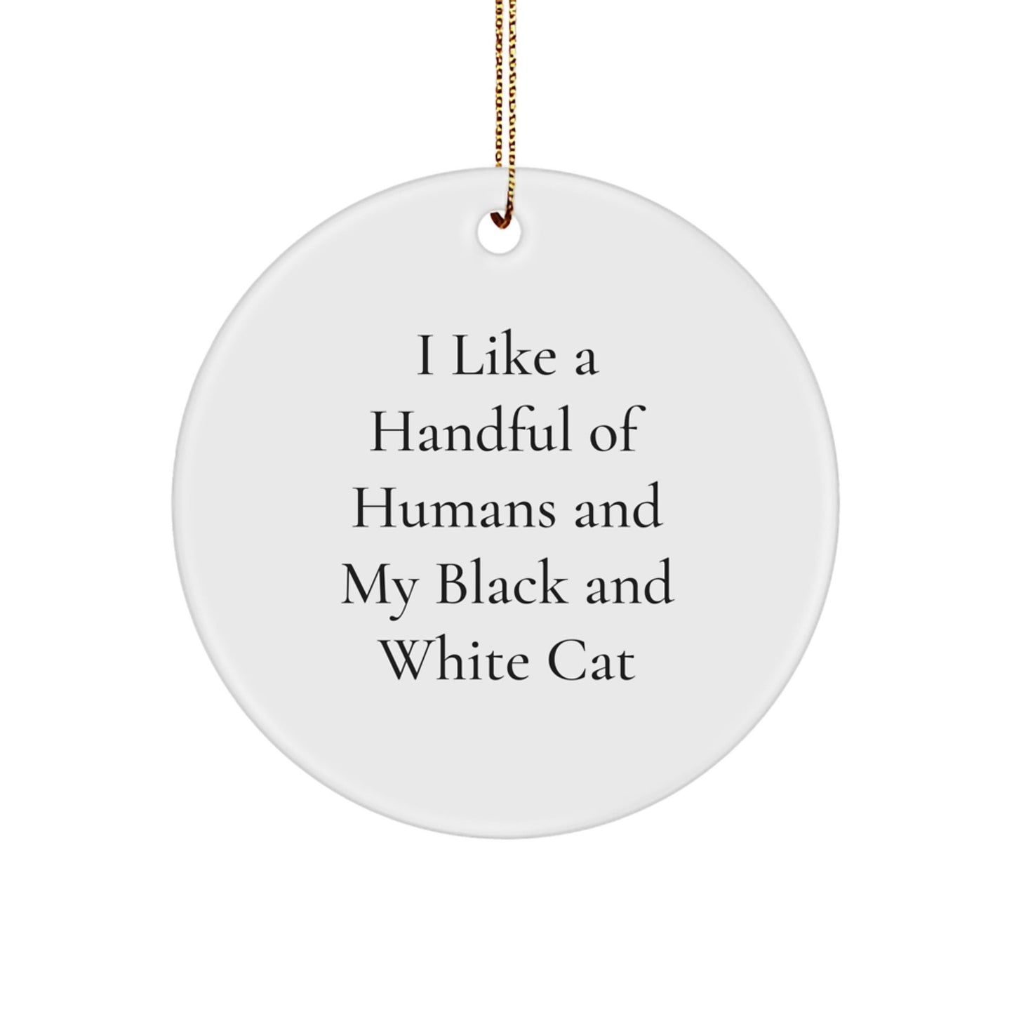 With its vibrant white color and bright, vivid design, this ornament is sure to delight. The quote 'I Like A Handful Of Humans And My Black And White Cat' adds a touch of humor and whimsy, making it a great addition to any Black and White Cat lover's home.