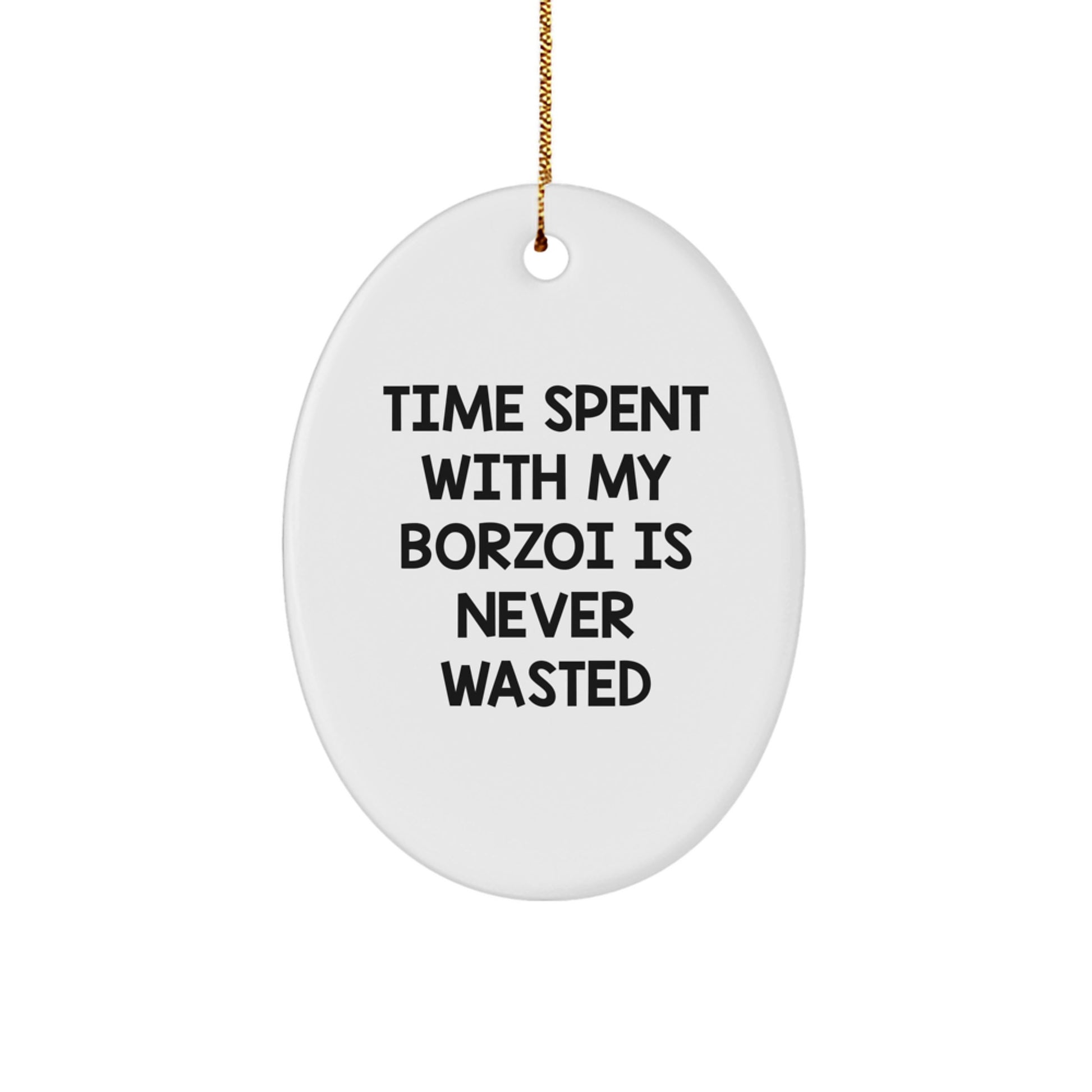 Are you a Borzoi Dog enthusiast or looking for a special gift for a Borzoi Dog lover? This beautiful Oval Ornament is the perfect way to show your love and appreciation. With a quote that resonates with every Borzoi Dog owner, 'Time Spent with My Borzoi is Never Wasted', this ornament is a thoughtful and unique gift for any occasion. Whether it's Christmas or any other special day, this ornament is sure to bring a smile to the face of your loved one. Made from sturdy MDF with a high-gloss finish, this ornament is lightweight and resistant to breaking, making it a great choice for households with children or pets. The vibrant colors and festive gold cord make it easy to hang and decorate your home. Give the gift of love and affection to your friends and family with this lovely Borzoi Dog Oval Ornament. Share the joy and happiness of your Borzoi Dog with others and make it a memorable gift. Don't miss out on this opportunity to show your love and appreciation for your Borzoi Dog. Don't miss out and make it a special gift for your loved ones.