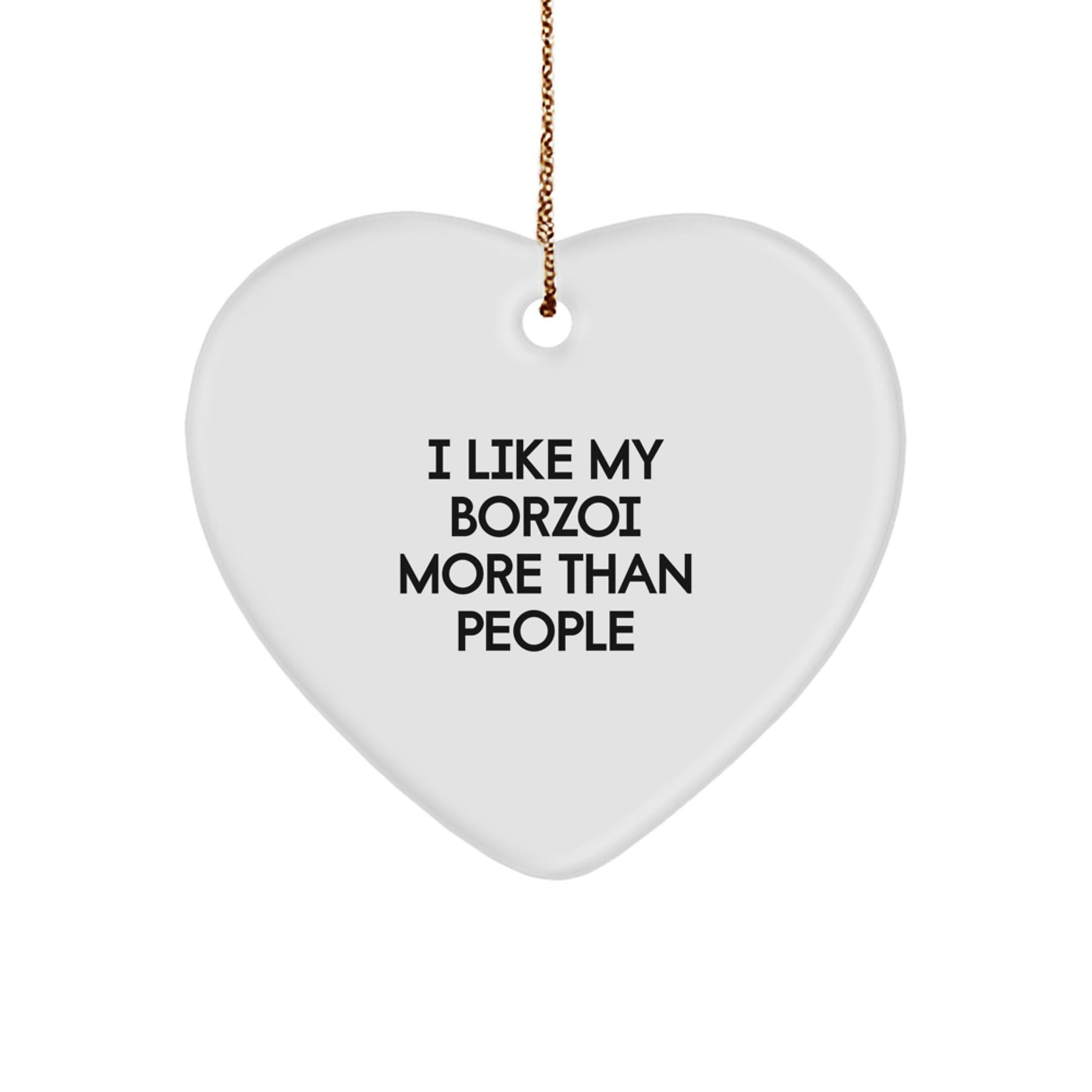 - Showcase your love for Borzoi Dogs with this unique heart ornament, featuring the quote 'I Like My Borzoi More Than People'.