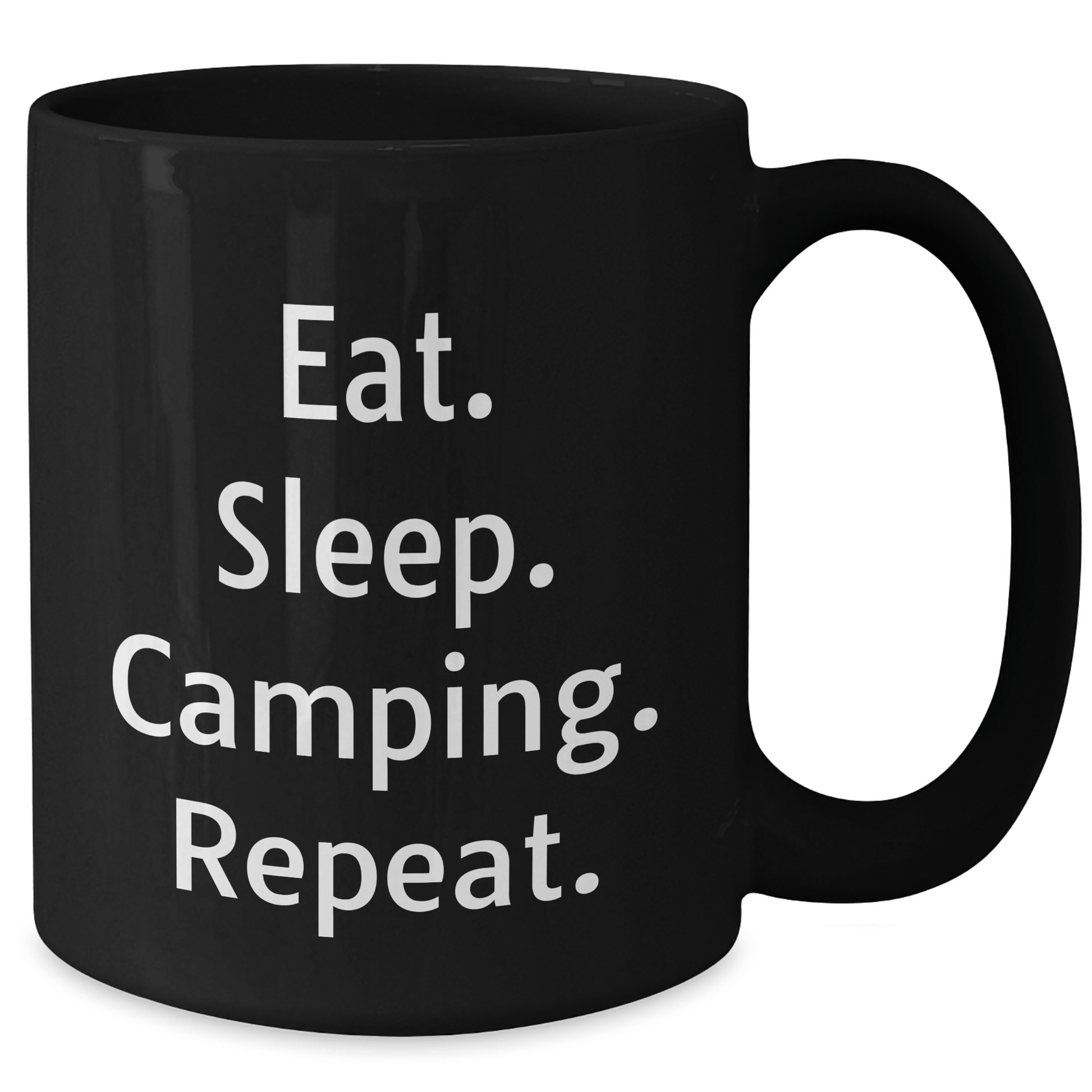 Get ready to fuel your camping adventures with this funny black coffee mug that reads 'Eat. Sleep. Camping. Repeat.' The ultimate camping enthusiast gift for Father's Day, this ceramic mug is microwave and dishwasher safe, making it easy to clean and reuse. Whether you're a seasoned camping or just starting out, this gift is sure to bring a smile to the face of any outdoor enthusiast.