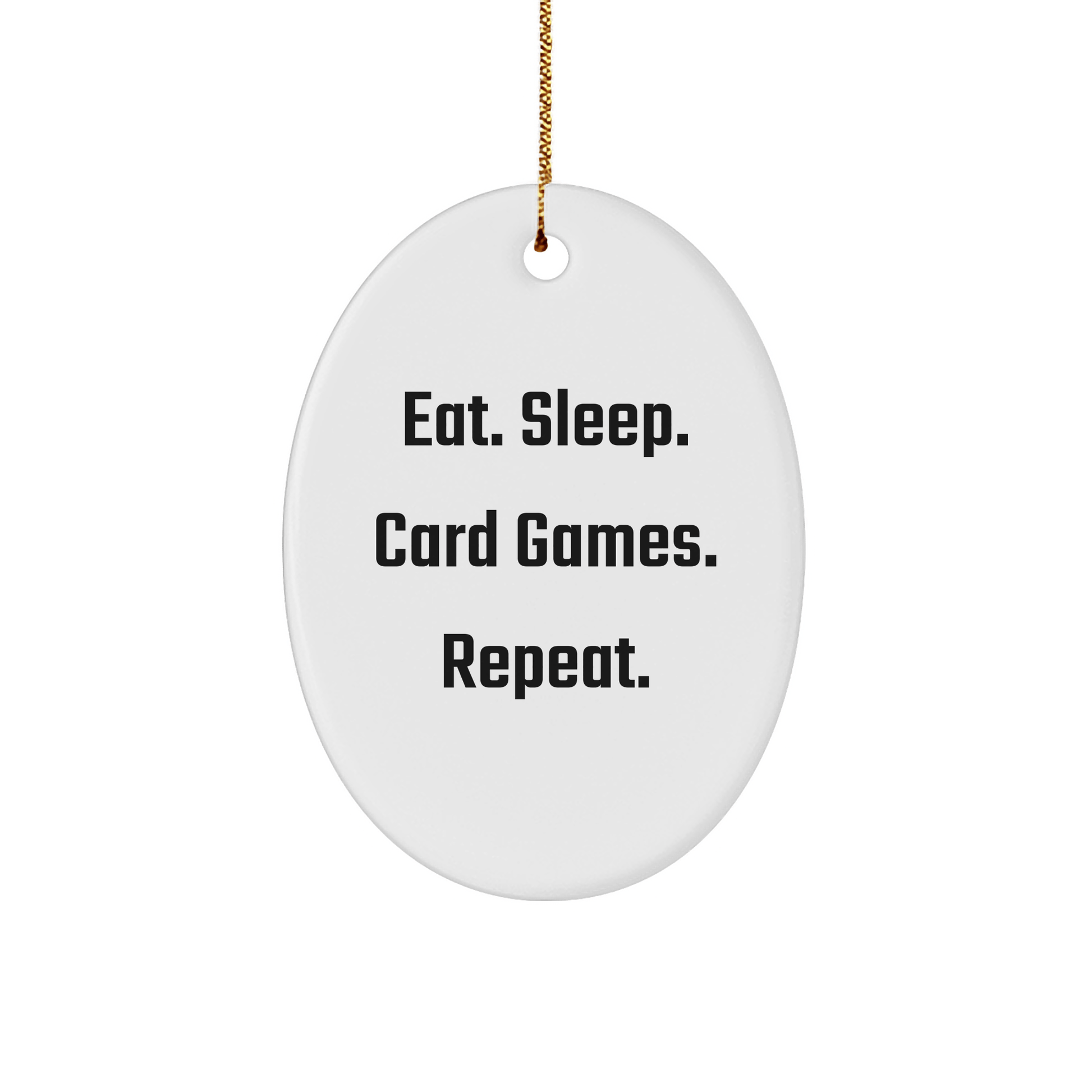 Are you a Card Games enthusiast or know someone who is? Then this Oval Ornament is the ideal gift for them! With a fun and quirky quote, Eat. Sleep. Card Games. Repeat., this ornament is sure to bring a smile to their face. Made from sturdy MDF with a high-gloss plastic finish, it's lightweight and resistant to breaking, making it a great choice for households with children or pets. The vibrant colors and festive gold cord make it perfect for stress-free decorating. Whether you're a seasoned Card Games player or just starting out, this ornament is a great way to show off your love for the game. So why not get your friends or family a unique Oval Ornament this Christmas? They'll surely appreciate the thought and humor behind it. So go ahead and get your Card Games Oval Ornament today!