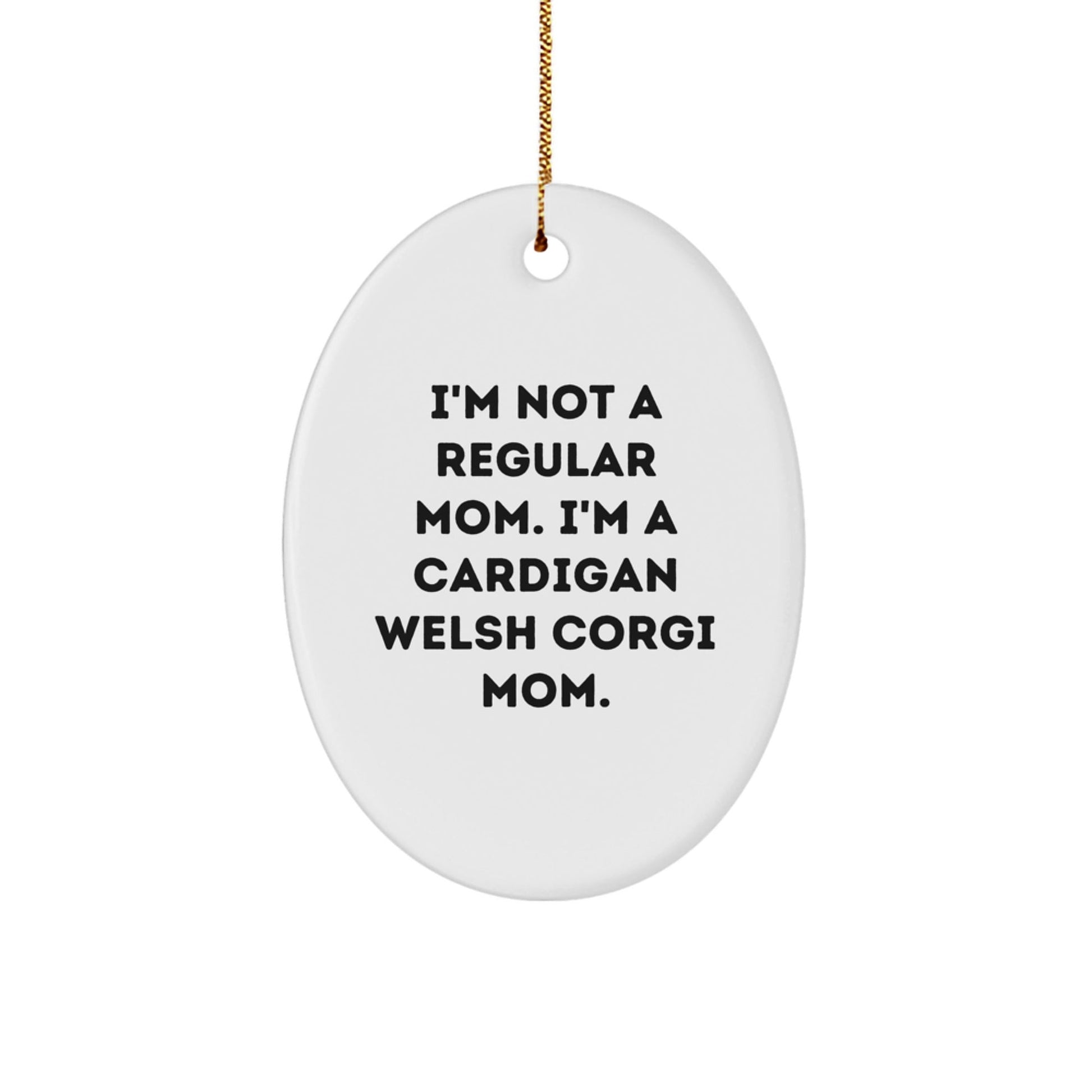 Are you a Cardigan Welsh Corgi mom or dad looking for a unique and funny gift for your furry friend's human mom or dad? Look no further! This adorable Oval Ornament is the perfect way to express your love and dedication to your Cardigan Welsh Corgi. The vibrant colors and cute design make it a standout on any Christmas tree or decorative shelf. As the quote says, 'I'm Not A Regular Mom. I'm A Cardigan Welsh Corgi Mom,' this ornament is sure to bring a smile to the faces of all Cardigan Welsh Corgi enthusiasts. The sturdy MDF material and high-gloss plastic finish ensure that this ornament will withstand the test of time and become a treasured keepsake. Whether you're giving it as a gift to a fellow Cardigan Welsh Corgi lover or keeping it for yourself, this Oval Ornament is sure to be a hit this holiday season. So why not get one for yourself and your loved ones and make this Christmas one to remember?