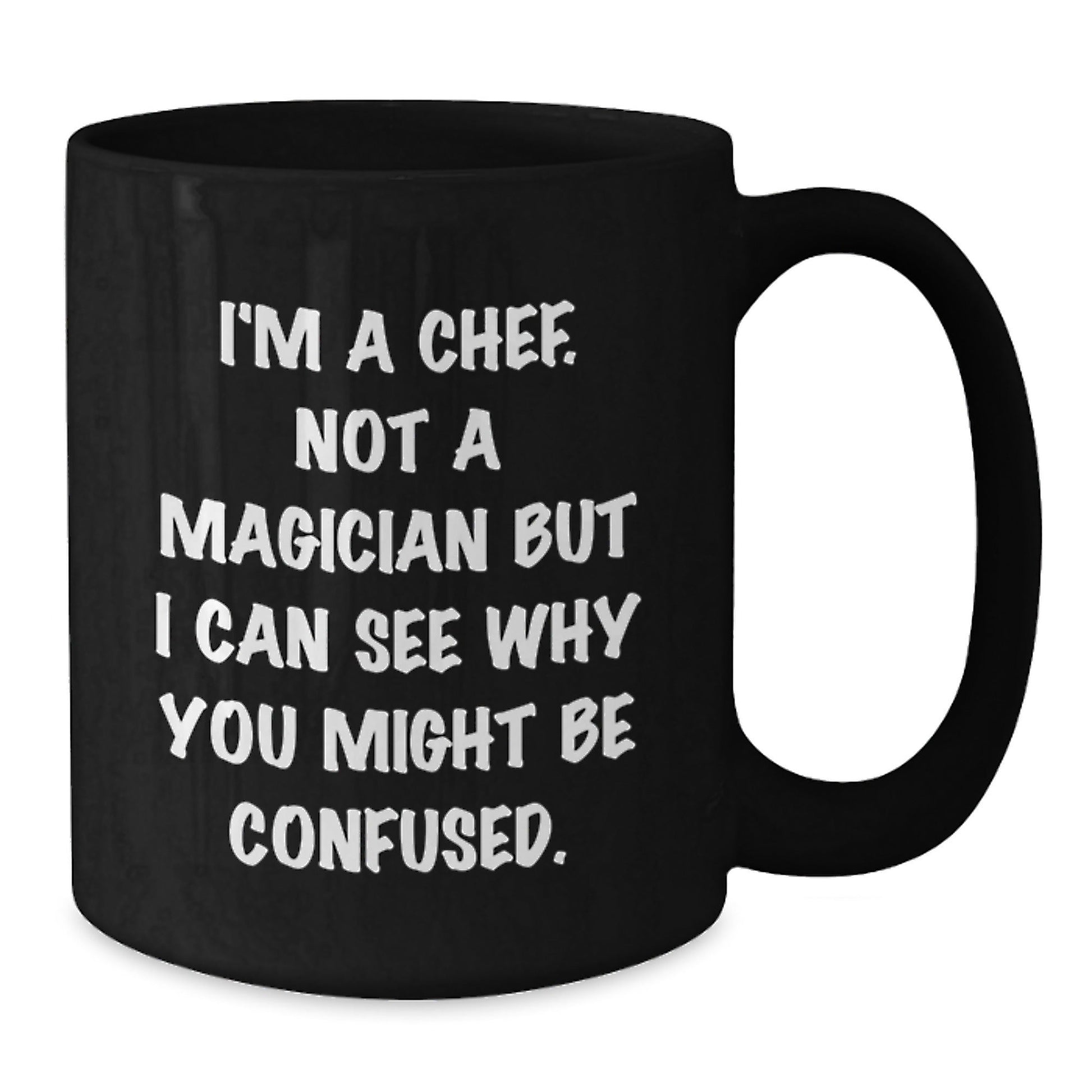 Are you looking for a unique gift for the chef in your life? Look no further! This funny quote black coffee mug is the perfect addition to any kitchen. I'm A Chef. Not A Magician But I Can See Why You Might Be Confused. is a humorous take on the chef's role, making it a great conversation starter. Whether you're a foodie or just appreciate a good laugh, this mug is sure to bring a smile to your face. The ceramic mug is available in black with a capacity of 11oz or 15oz, making it perfect for hot coffee or tea. Plus, it's microwave and dishwasher safe, making it easy to clean and maintain. If you're looking for a birthday gift for a chef, this unique mug is sure to impress. Give it as a gift from friends to chef, and they'll appreciate the thought and humor.