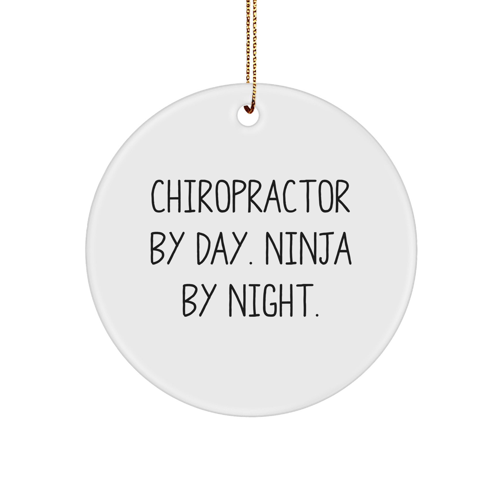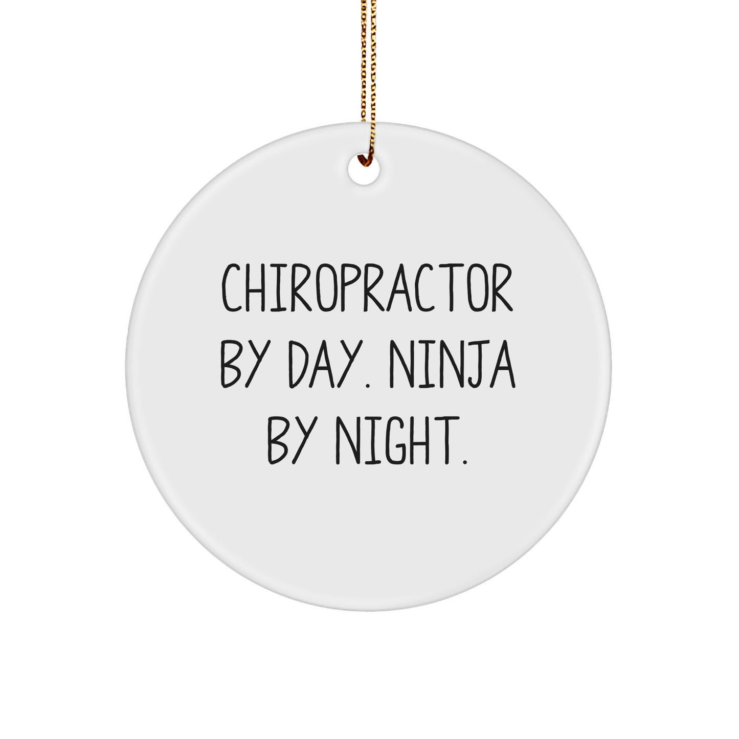 This ornament is vibrantly printed from edge-to-edge via Sublimation, ensuring bright, vivid colors. The festive gold cord makes it easy to hang, perfect for stress-free decorating. What makes this ornament even more special is the quote 'Chiropractor By Day. Ninja By Night.' which adds a touch of humor and personality to the gift.