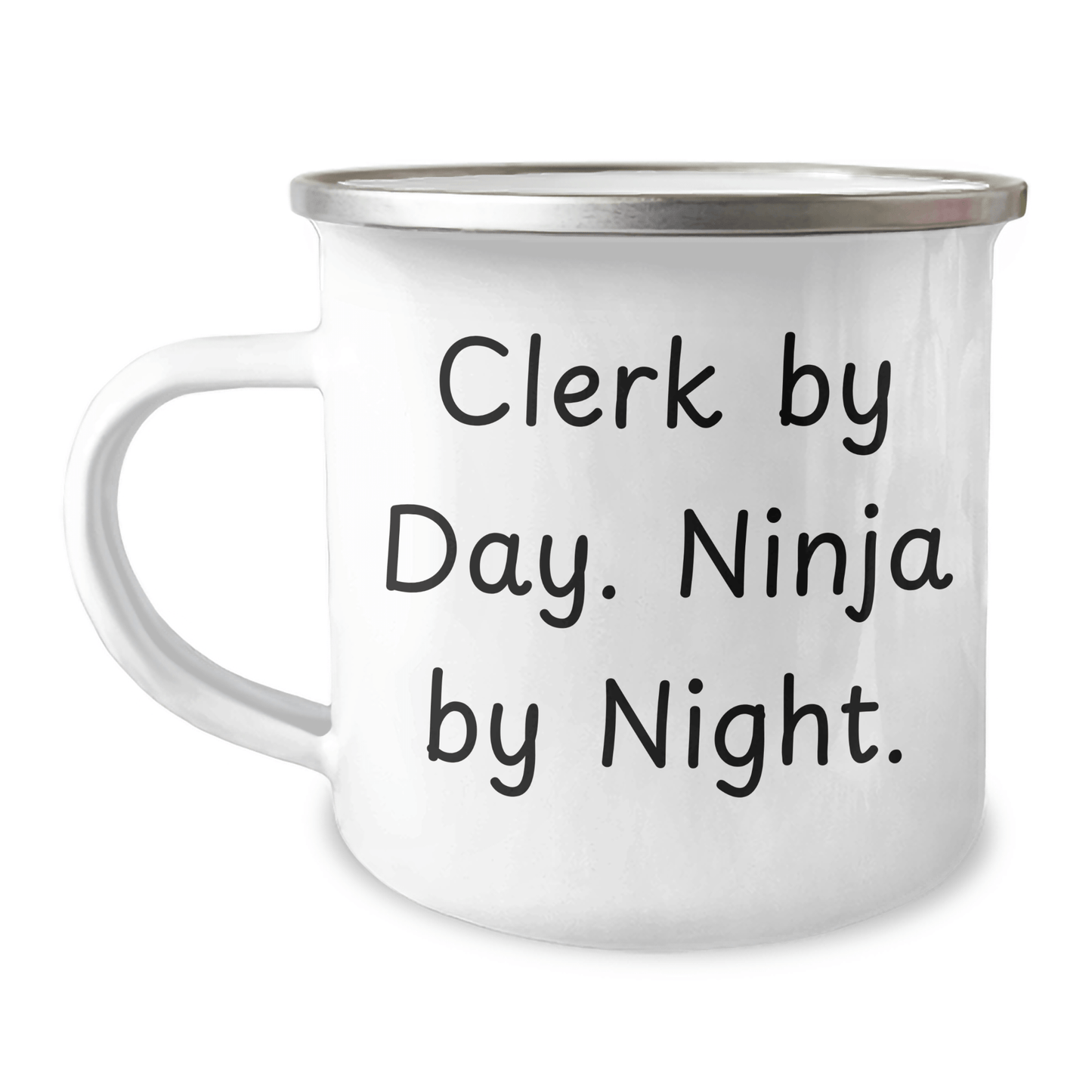 - Get ready to 'Clerk By Day. Ninja By Night.' with this camping mug, designed specifically for graduates and professionals like you. With a 12 oz capacity, it's the perfect size for your morning coffee or afternoon tea. The stainless steel with enamel finish ensures durability and longevity, making it a thoughtful gift for any occasion.