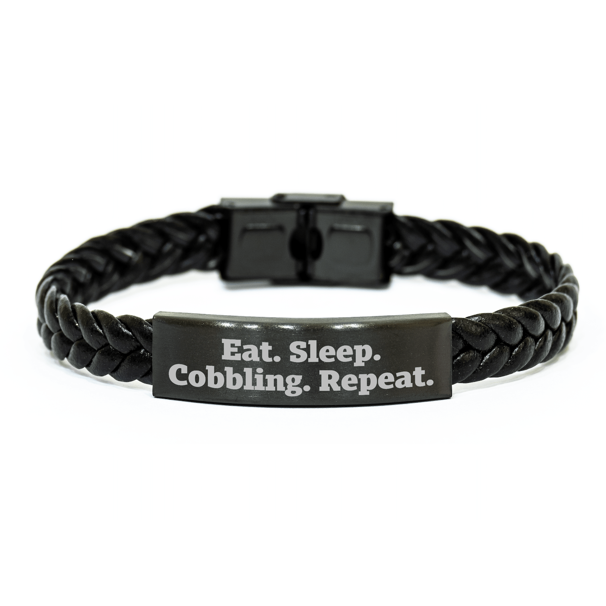 - Experience the ultimate in cobbling craftsmanship with our Interlaced Leather Bracelet, featuring a unique blend of stainless steel and PU leather for a stylish and durable accessory. 'Eat. Sleep. Cobbling. Repeat.' embodies the passion and dedication that goes into crafting this exceptional piece. Perfect for Father's Day gifting, this interlaced leather bracelet is sure to delight dad with its sleek design and premium materials.