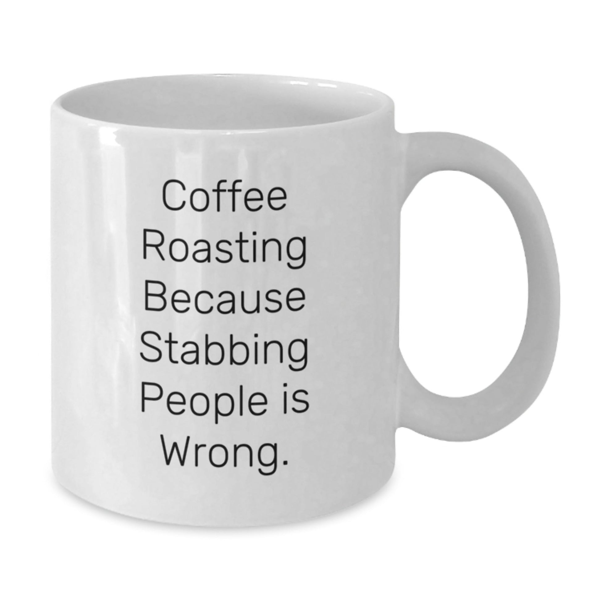 - Make every morning a special occasion with our 'Coffee Roasting Because Stabbing People Is Wrong.' white coffee mug. With its unique design and high-quality ceramic material, this mug is sure to become your new favorite way to start the day. So why not give it a try and start sipping your way to a happier you?