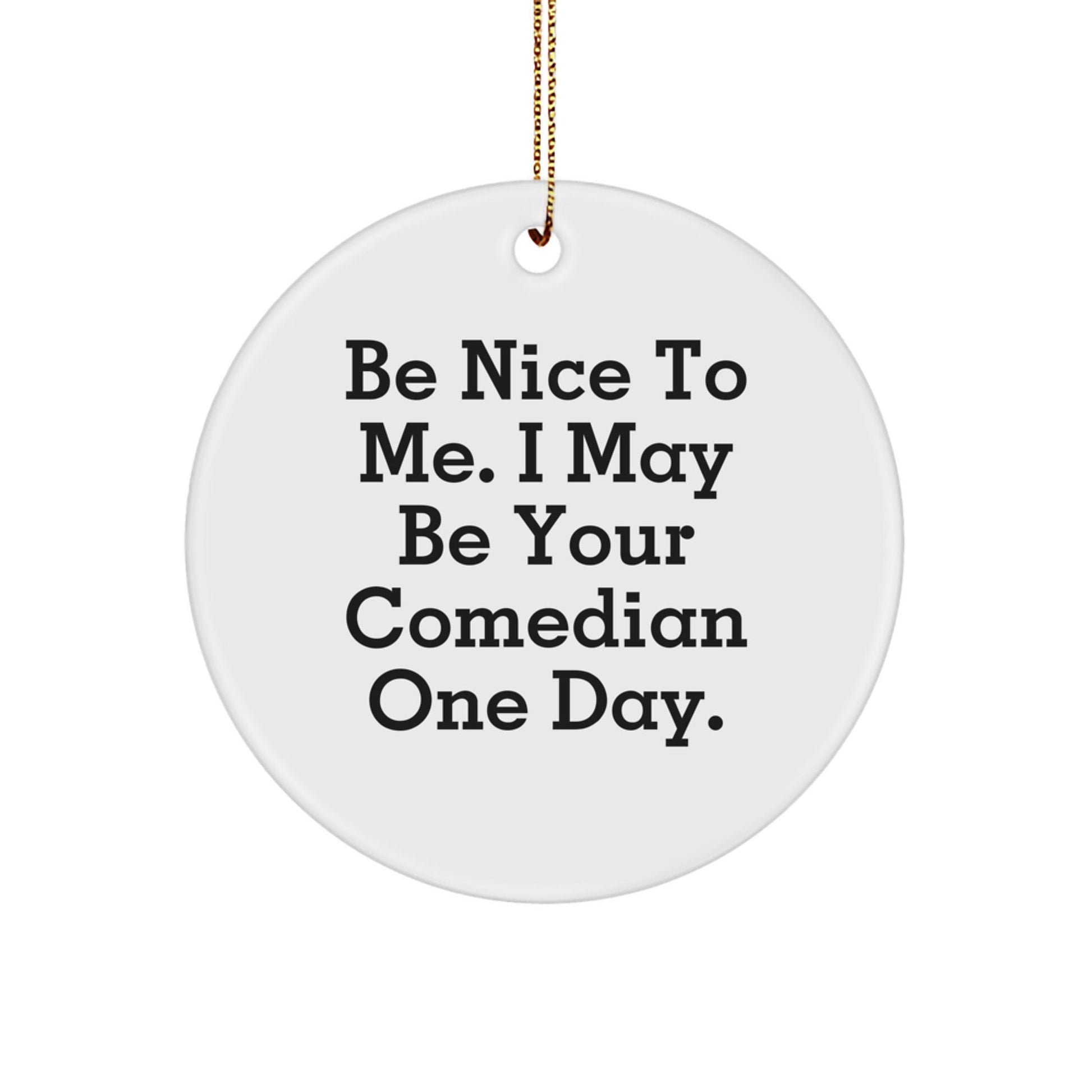 This circle ornament is a great conversation starter and will add a touch of humor to any room. It's the perfect way to show your appreciation for the comedian in your life, and it's a unique gift that will be treasured for years to come. So why wait? Get your 'Be Nice To Me. I May Be Your Comedian One Day.' circle ornament today and make someone's holiday season a little brighter!