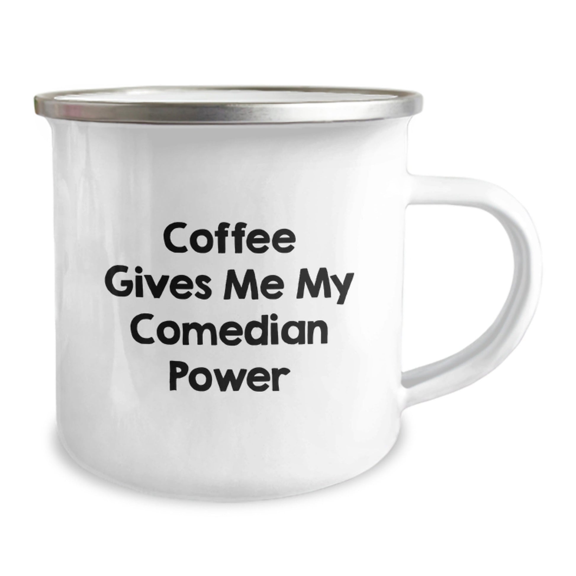 This stainless steel mug with enamel finish is sturdy and easy to clean, making it a great companion for any camping trip or daily coffee routine. The quote 'Coffee Gives Me My Comedian Power' is a fun and relatable phrase that will bring a smile to the face of any comedian.