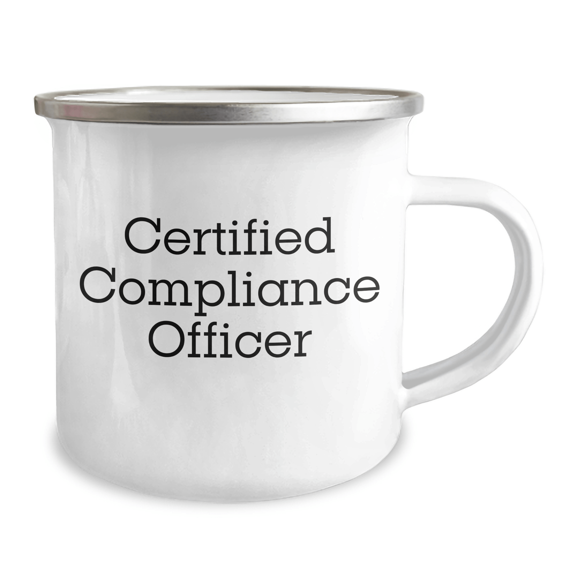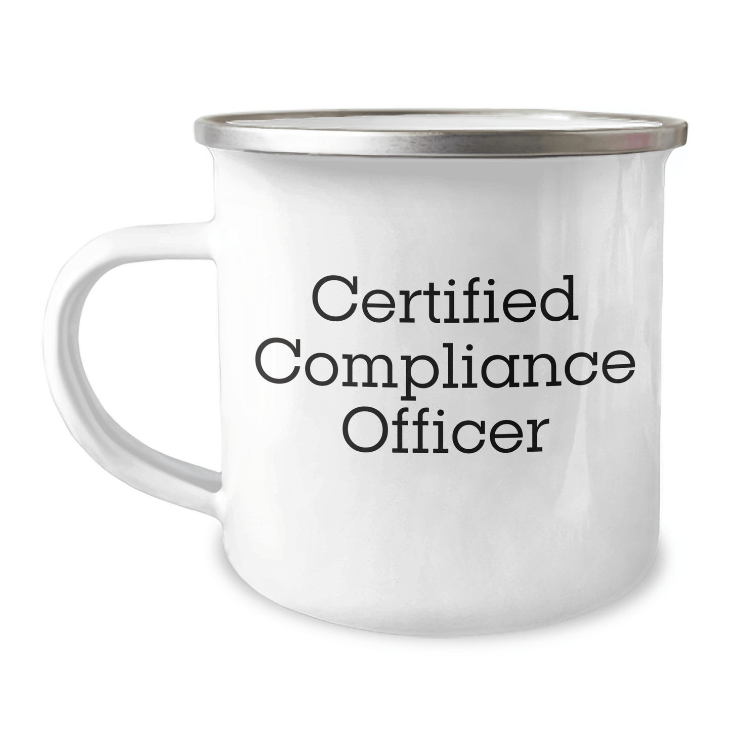 - This 'Certified Compliance Officer' Camping Mug is a unique and thoughtful gift for Compliance Officers who love the outdoors. The stainless steel construction with enamel finish ensures durability and longevity, making it a great addition to any camping gear or office supply.