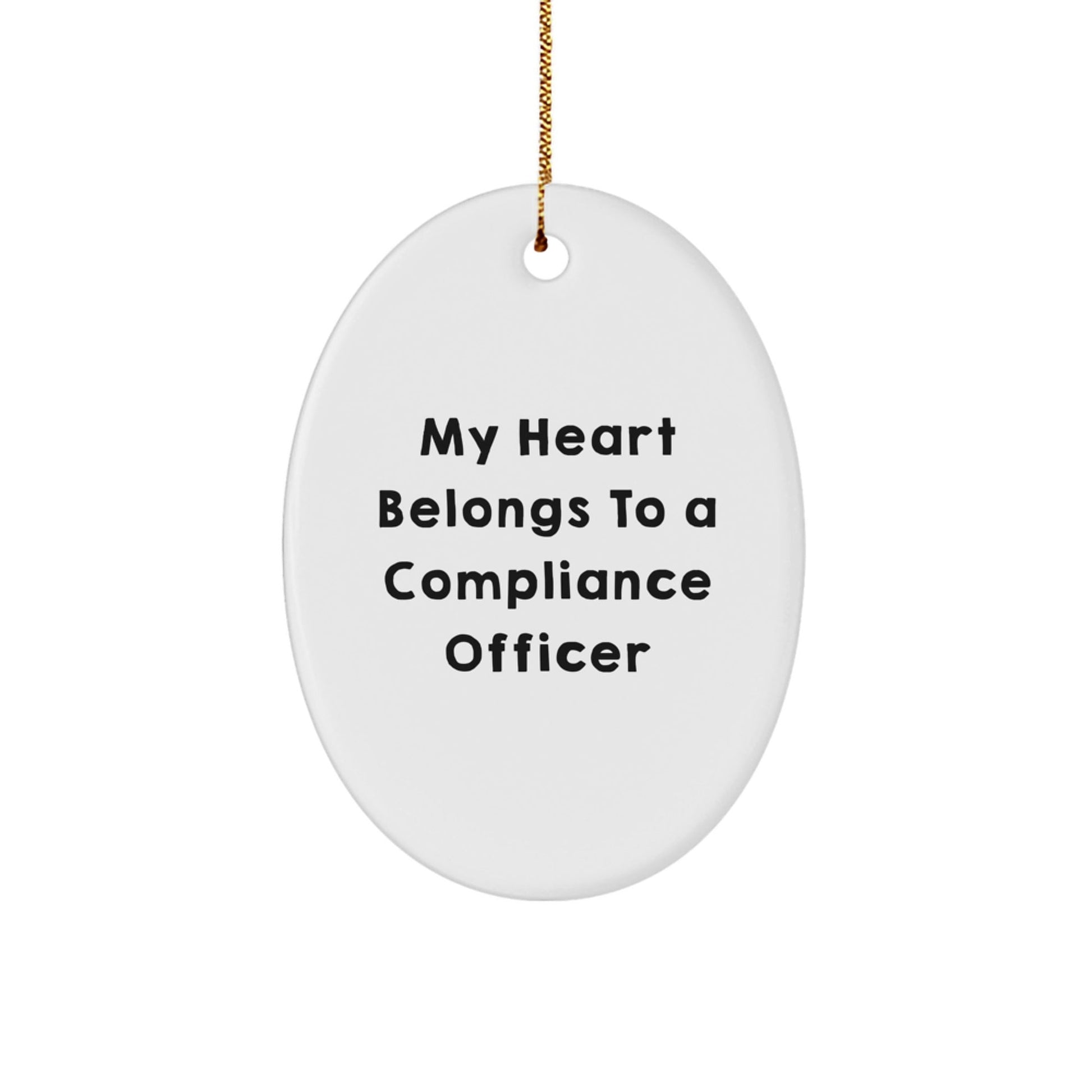Are you looking for a unique gift for a Compliance Officer in your life? Look no further! Our oval ornament is crafted with a funny quote 'My Heart Belongs To A Compliance Officer' that is sure to bring a smile to their face. The vibrant colors and high-gloss finish make it a perfect addition to any office or home decor.