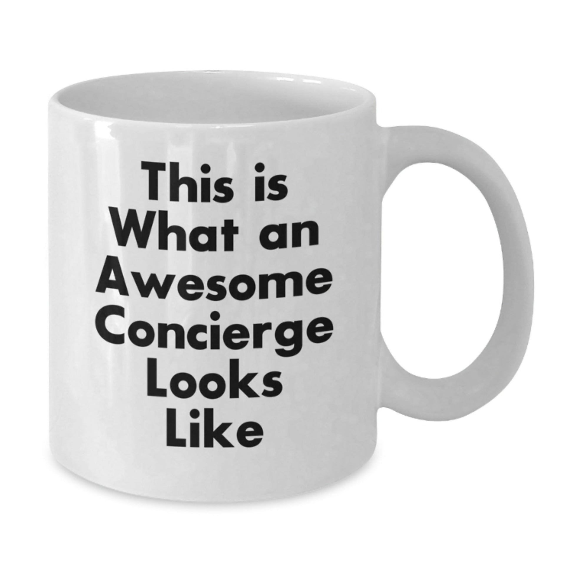 - This white coffee mug is the perfect way to show your appreciation for your favorite concierge, with a quote that reads 'This Is What An Awesome Concierge Looks Like'. Made from ceramic, it's microwave and dishwasher safe, making it easy to clean and use.