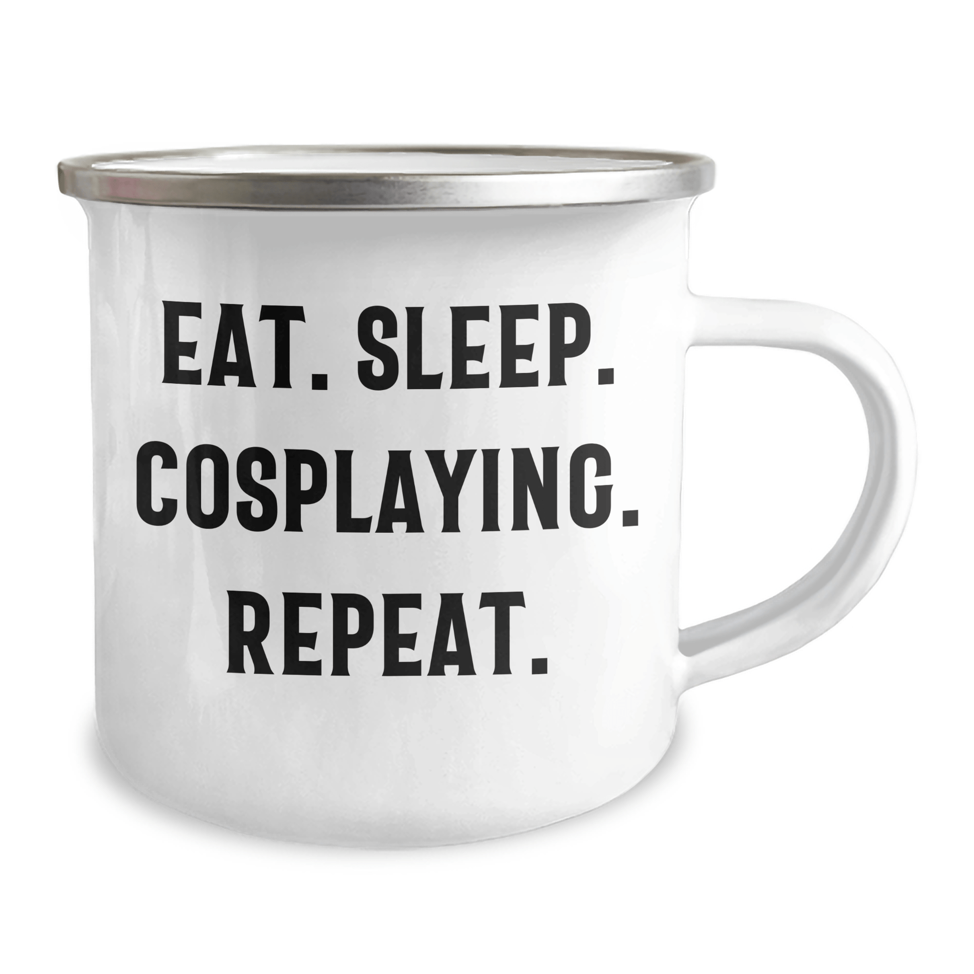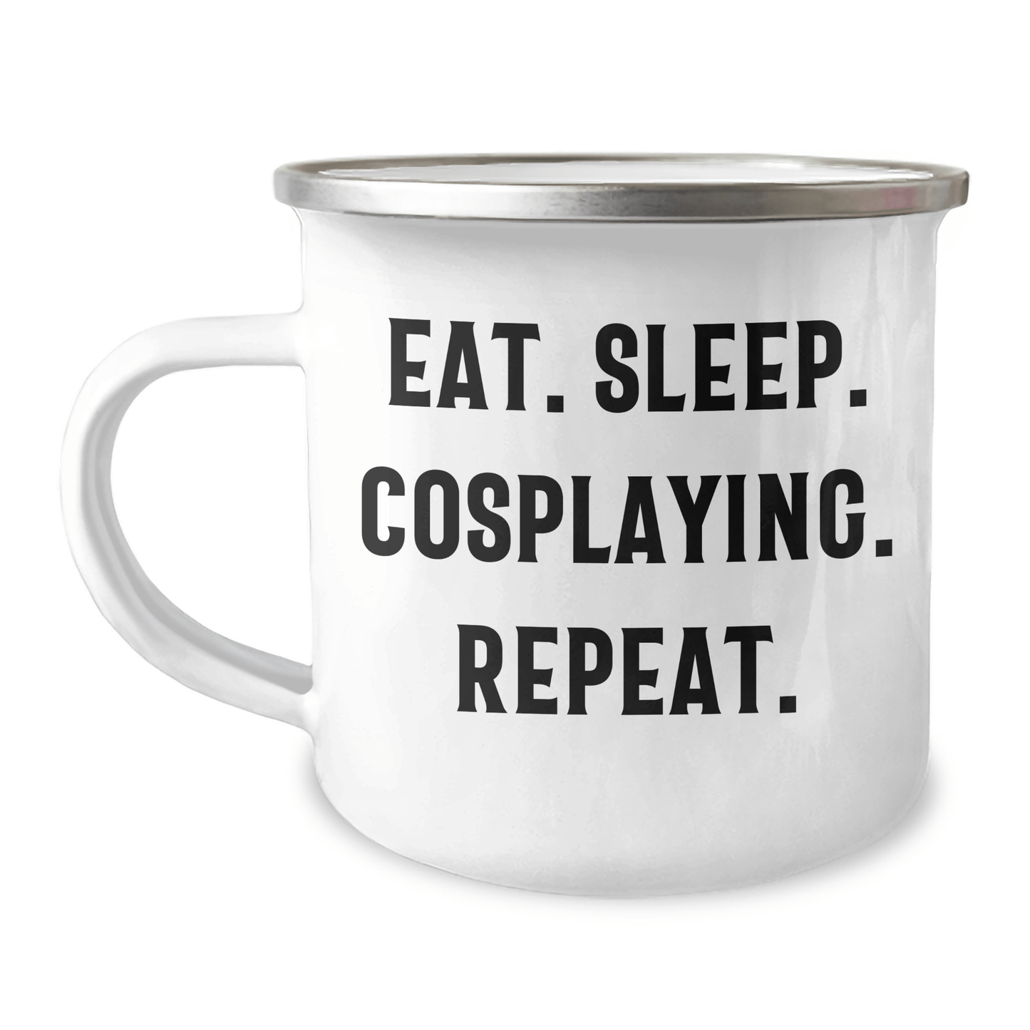 Celebrate your passion for Cosplaying with this unique and funny camping mug! It's the ideal gift for your favorite Cosplaying friends or family members on Father's Day. The quote 'Eat. Sleep. Cosplaying. Repeat.' is a humorous representation of the dedication and enthusiasm that Cosplayers have for their craft. This Camping Mug is made of stainless steel with an enamel finish, ensuring durability and longevity. Hand washing with mild detergent is recommended. The permanent printing won't fade after washing, making it a great conversation starter at any Cosplaying event or gathering. Whether you're a Cosplayer yourself or just an enthusiast, this gift is sure to bring a smile to the recipient's face. So, why not gift your loved ones with something that shows you care about their passion?