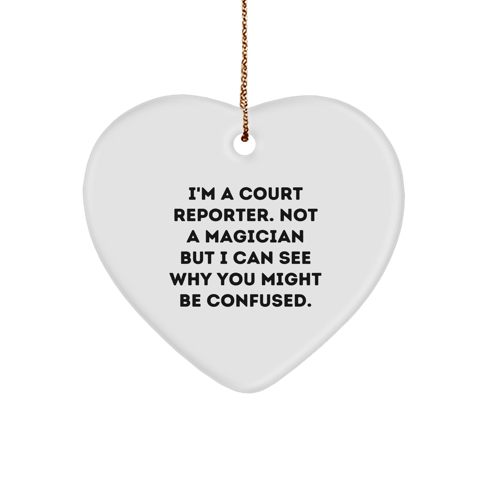 If you're looking for a unique gift for your favorite Court Reporter, look no further! This funny heart ornament is the perfect way to show your appreciation for their hard work and dedication. 'I'm A Court Reporter. Not A Magician...' is a humorous quote that any Court Reporter would love. Made from sturdy MDF with a high-gloss plastic finish, this ornament is lightweight and resistant to breaking, making it a great choice for households with children or pets. It's also vibrantly printed from edge-to-edge via Sublimation, ensuring bright, vivid colors. The festive gold cord makes it easy to hang, perfect for stress-free decorating. Give this heartwarming gift to your Court Reporter friends and family this Christmas season. They'll appreciate the thought and humor behind it. So why not spread some cheer and give the gift of laughter this holiday season? Don't miss out and make it a Christmas to remember!