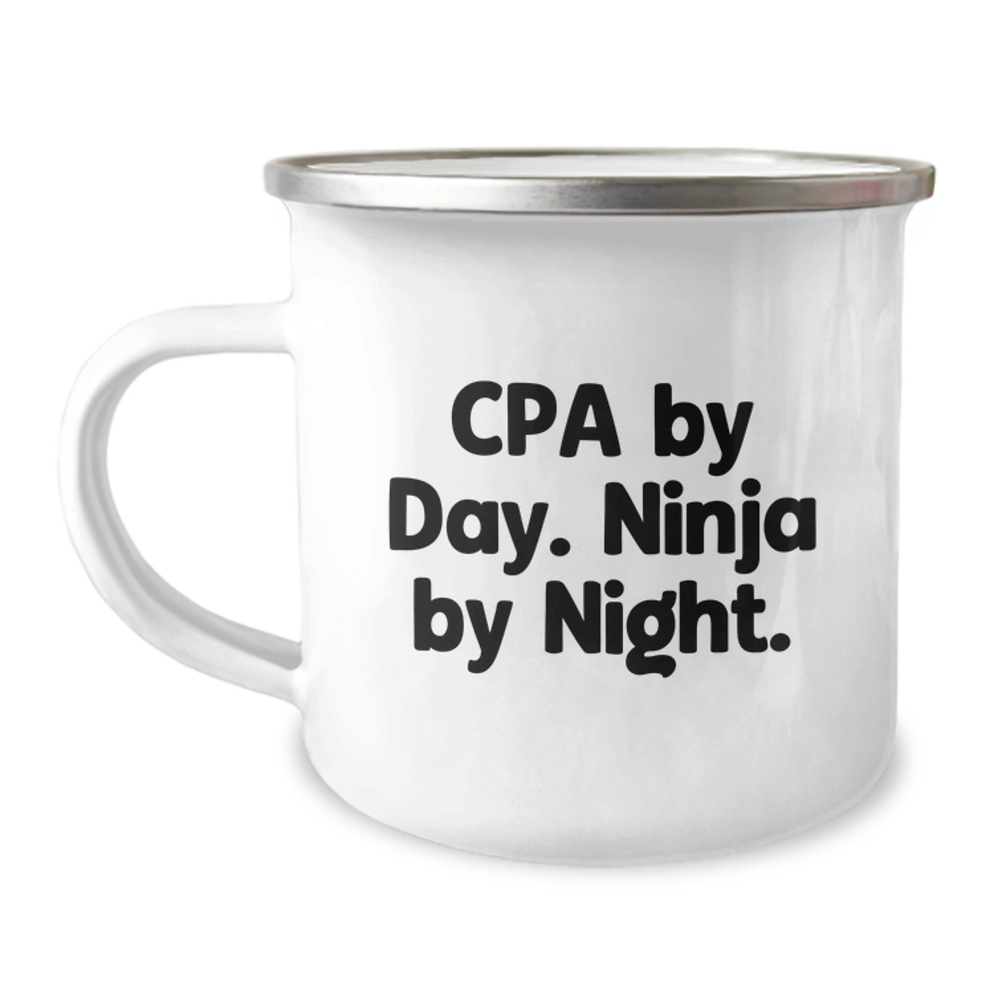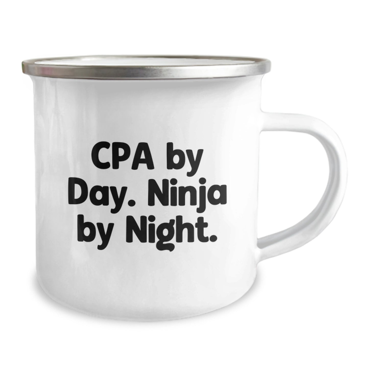 If you know a CPA enthusiast, this funny Camping Mug is the ideal gift for them! Cpa By Day. Ninja By Night. is a humorous quote that will make them laugh out loud. The 12 oz capacity stainless steel mug with enamel finish is sturdy and easy to clean. It's a unique gift for any CPA professional, whether they're a man or woman. This Camping Mug is not only functional but also a thoughtful present for friends, family, or coworkers. It's the perfect birthday gift for any CPA. So, surprise them with this funny Camping Mug and show them you care. Get ready to make their day with this awesome CPA gift!