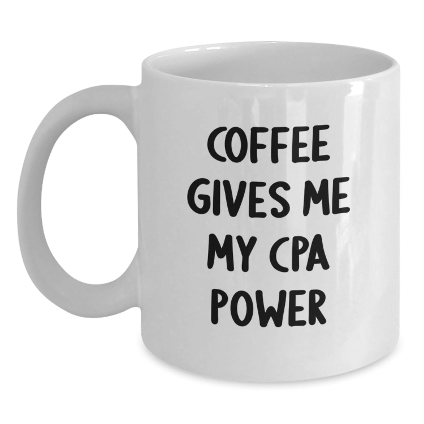 - This funny white coffee mug is the perfect way to show your appreciation and love for the CPA in your life; Made from ceramic, this mug is microwave and dishwasher safe, making it easy to clean and use; The quote 'Coffee Gives Me My Cpa Power' is a humorous take on the daily grind, making it a great addition to any CPA's morning routine; This mug is a unique and personalized way to show your appreciation for the CPAs in your life; Send this gift to your favorite CPA and let them know you care