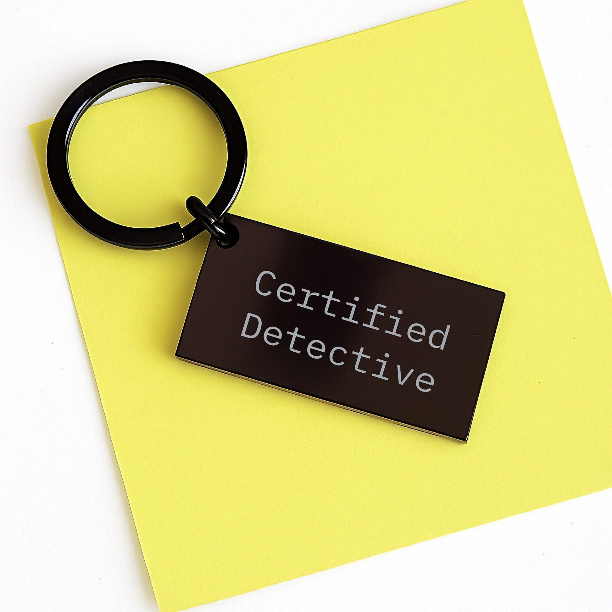 - Make a statement with this 'Certified Detective' keychain, perfect for the detective in your life. Its black color and stainless steel construction ensure a sleek and sturdy accessory that will withstand the test of time, featuring an engraved message that adds a personal touch.