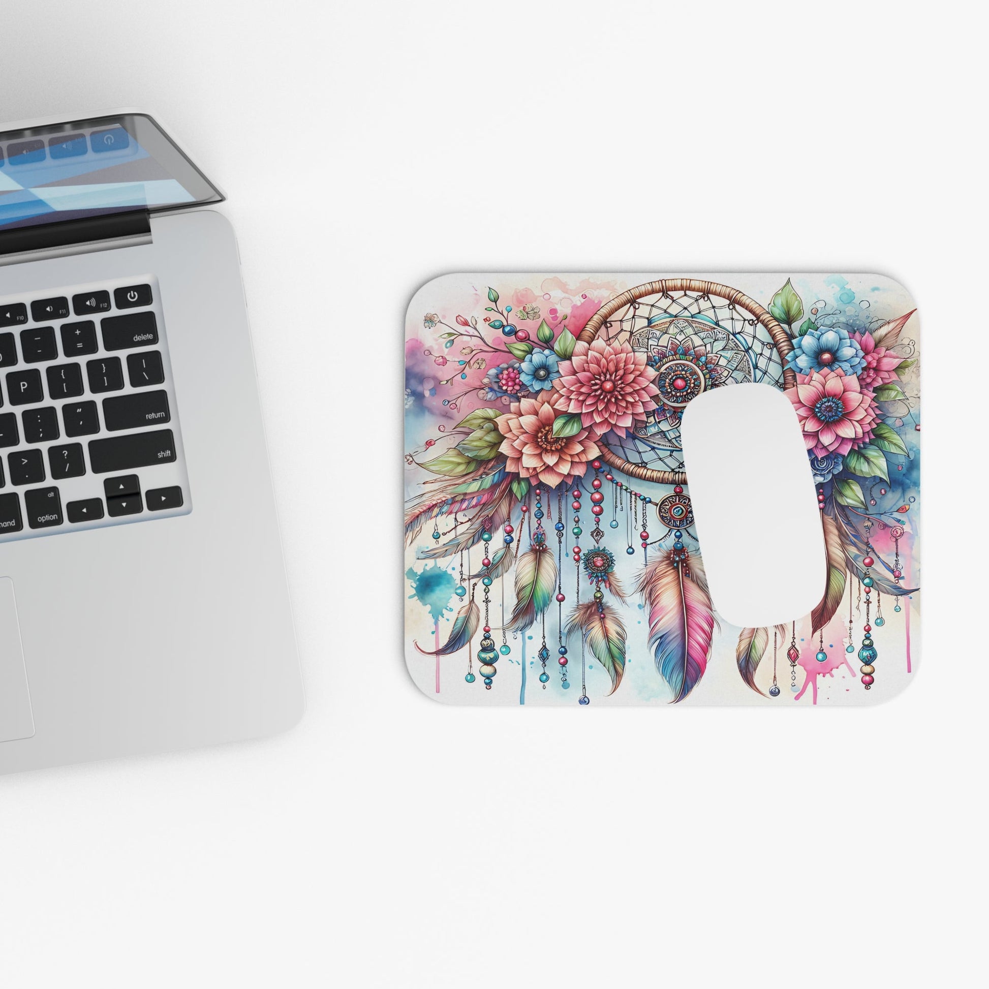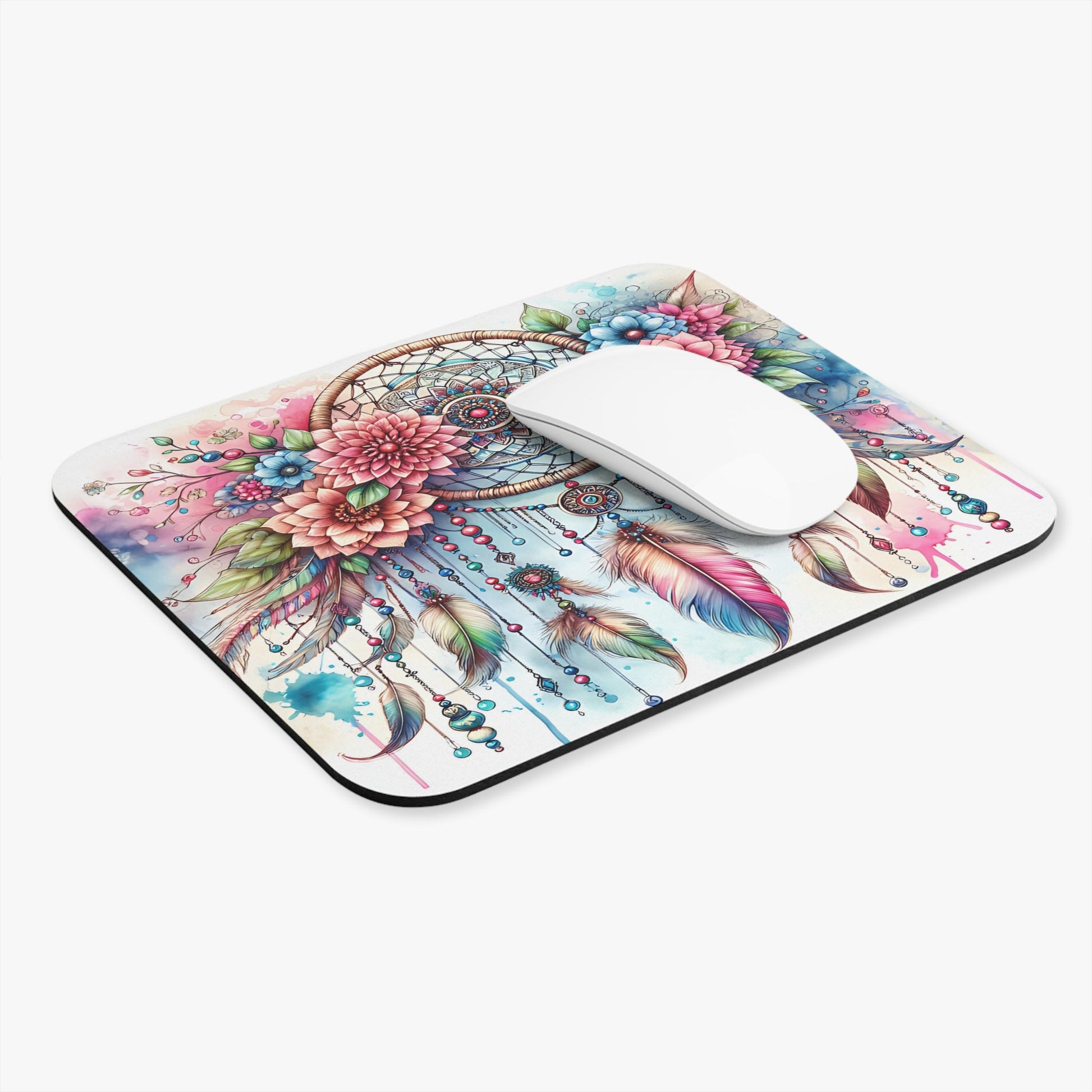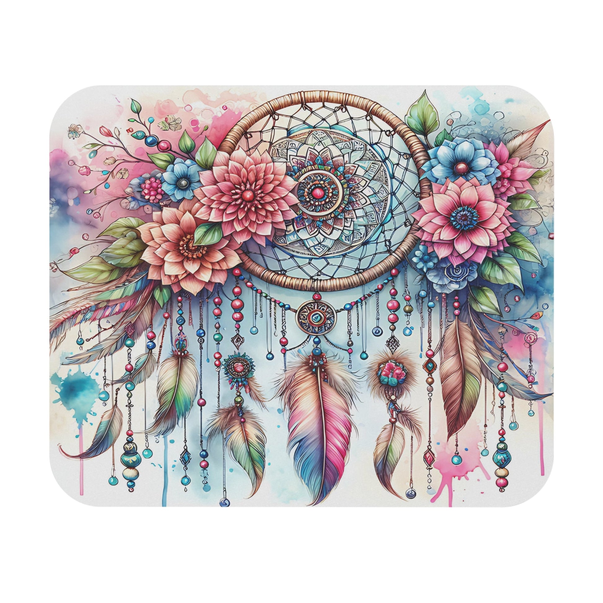 This Mouse Pad features a beautiful Dreamcatcher With Flowers design, giving off a calming and peaceful vibe. Perfect for anyone looking to add a touch of nature and serenity to their workspace. Ideal for those who enjoy floral patterns and dreamcatchers. Relevant for home offices, back-to-school season, and as a thoughtful gift for Mother's Day or birthdays.