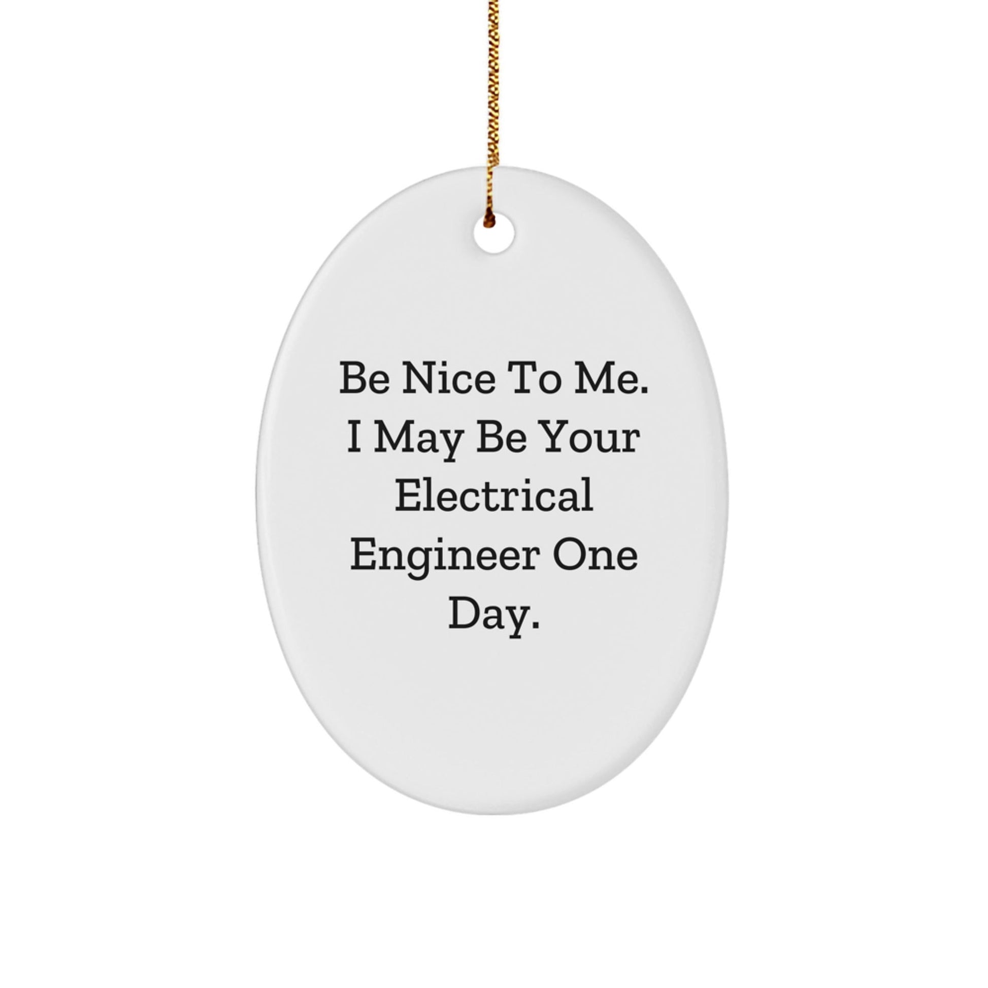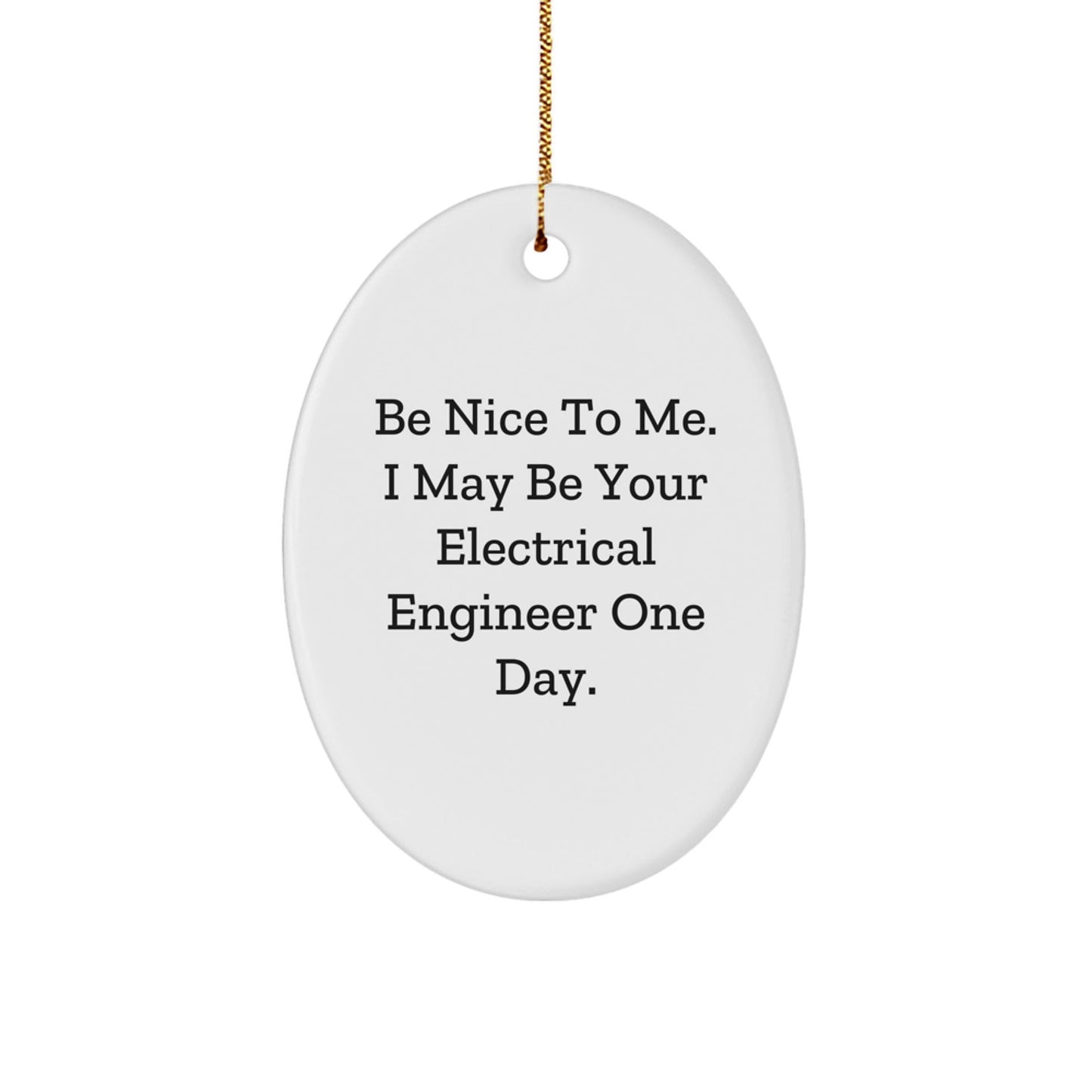 - Bring a touch of whimsy and fun to your holiday decor with this Oval Ornament, featuring the inspiring quote 'Be Nice To Me. I May Be Your Electrical Engineer One Day.' Its festive gold cord makes it easy to hang, and its vibrant colors will add a pop of color to any room. A unique gift idea for friends and family.
