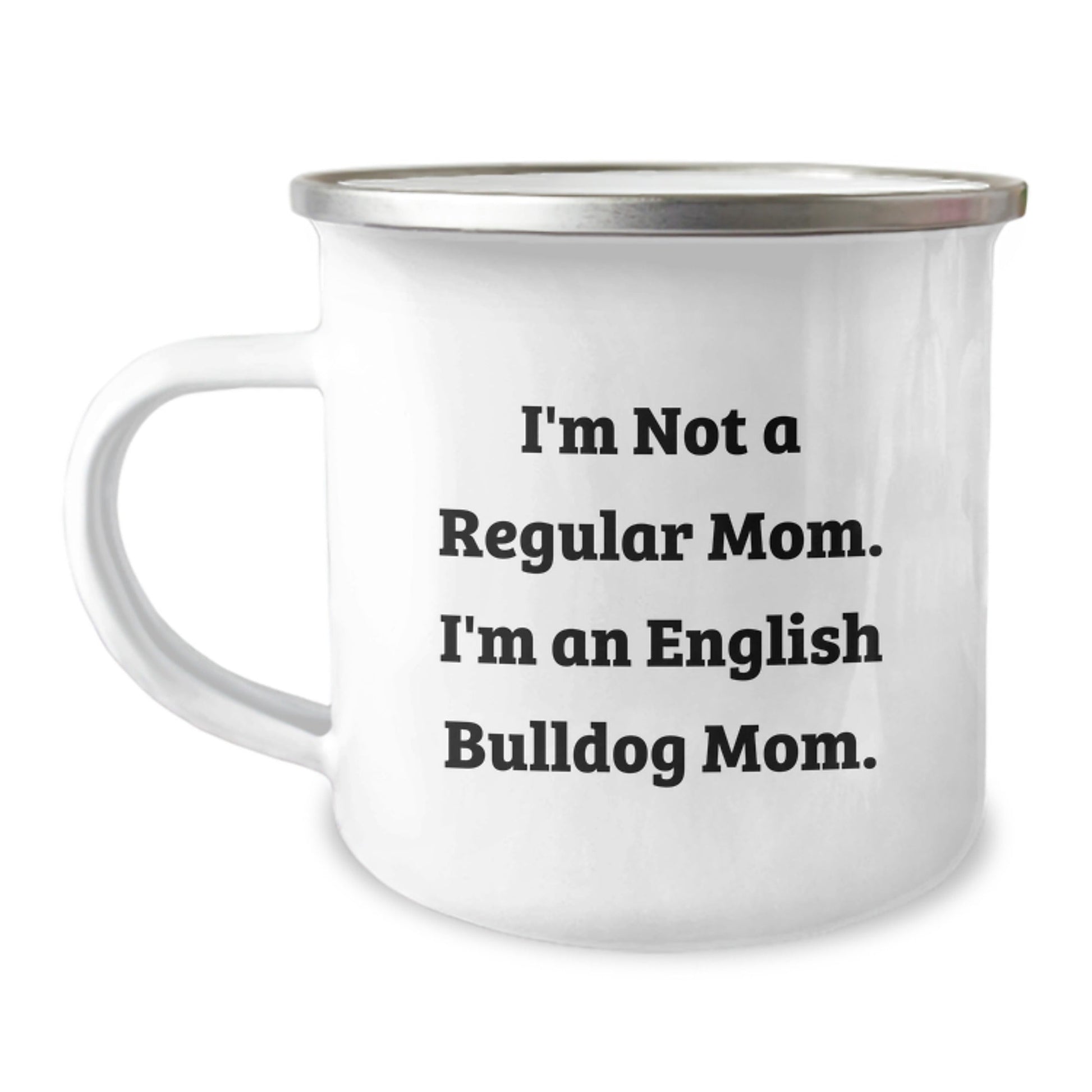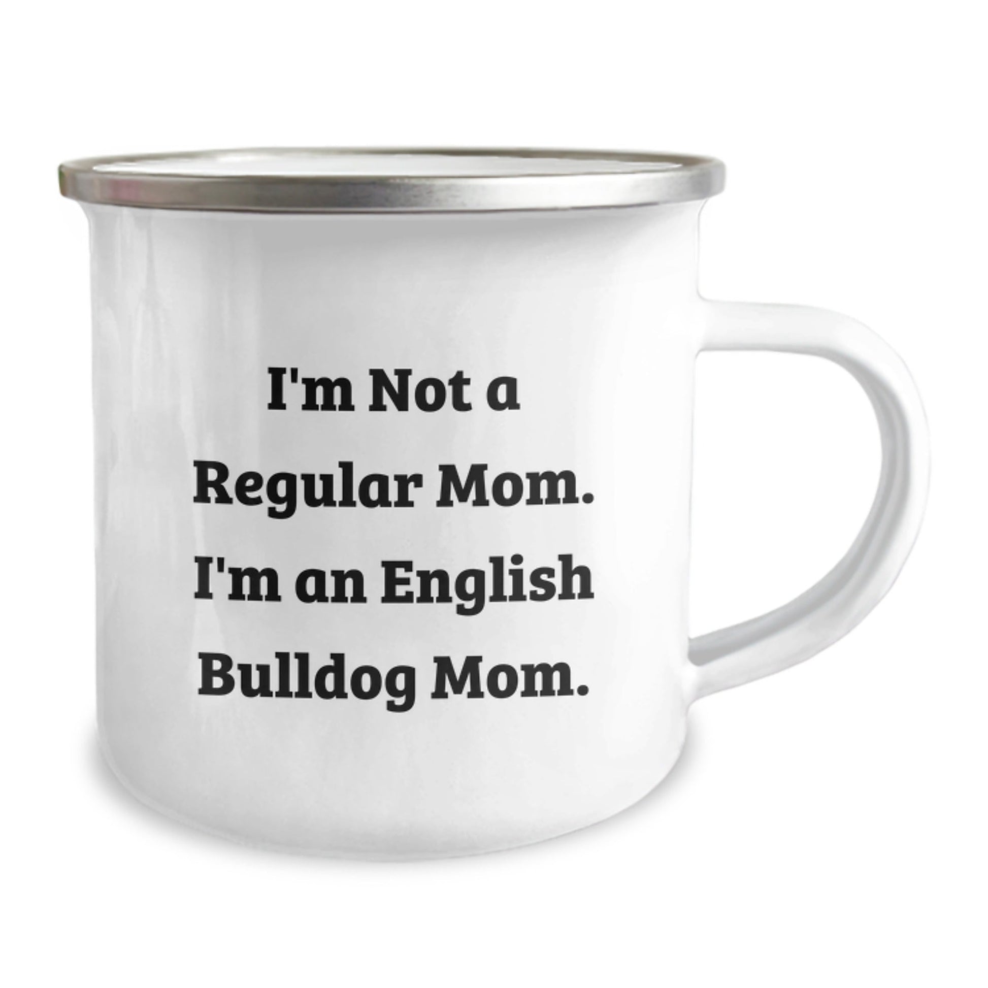 Are you an English Bulldog enthusiast or looking for a unique gift for an English Bulldog lover? Our 'I'm Not A Regular Mom. I'm An English Bulldog Mom.' quote on a camping mug is the perfect choice! This 12 oz stainless steel mug with enamel finish is a thoughtful gift for any English Bulldog mom or dad. Hand washing with mild detergent is recommended. Permanent printing ensures the quote won't fade after washing. Whether it's a graduation gift or just a fun way to show off your love for English Bulldogs, this camping mug is sure to bring a smile to their face. Give it as a gift from family, friends, or coworkers to celebrate this special occasion. This English Bulldog-themed camping mug is a great way to add some humor and personality to their morning coffee routine. With its sturdy construction and comfortable design, it's perfect for daily use or as a collectible item. Don't miss out on this opportunity to show your love and appreciation for English Bulldogs. Get your 'I'm Not A Regular Mom. I'm An English Bulldog Mom.' camping mug today!