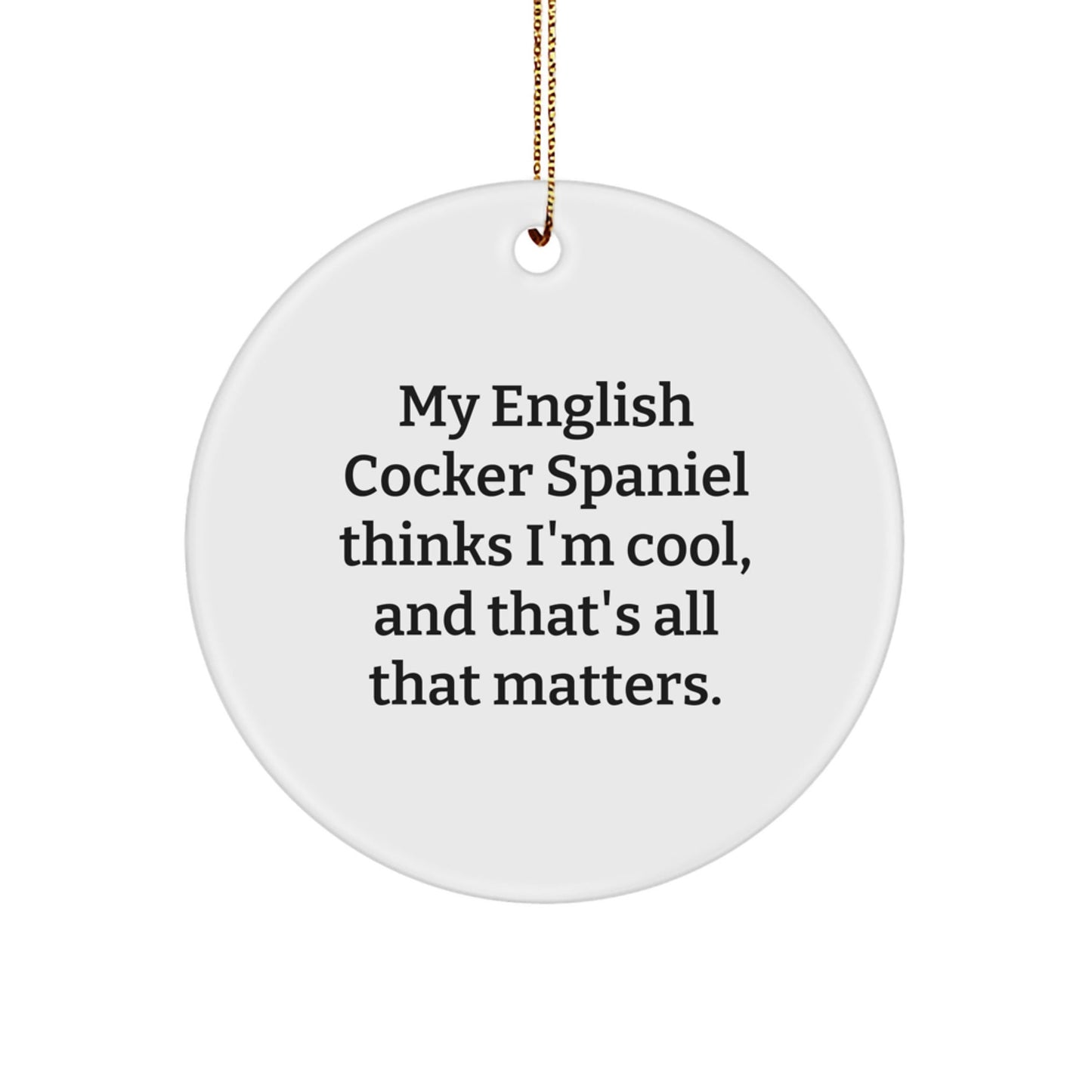 Are you an English Cocker Spaniel Dog enthusiast? Do you know someone who loves these adorable dogs? This Circle Ornament is the ideal gift for them! With its funny quote, 'My English Cocker Spaniel Thinks I'm Cool, And That's All That Matters.', it's sure to bring a smile to their face. The ornament is made of sturdy MDF with a high-gloss plastic finish and features a vibrant, sublimated design. It's lightweight, resistant to breaking, and ships with a festive gold cord for easy hanging. This unique gift is perfect for Christmas or any occasion. Give it to your loved ones as a thoughtful present and show them how much you care.