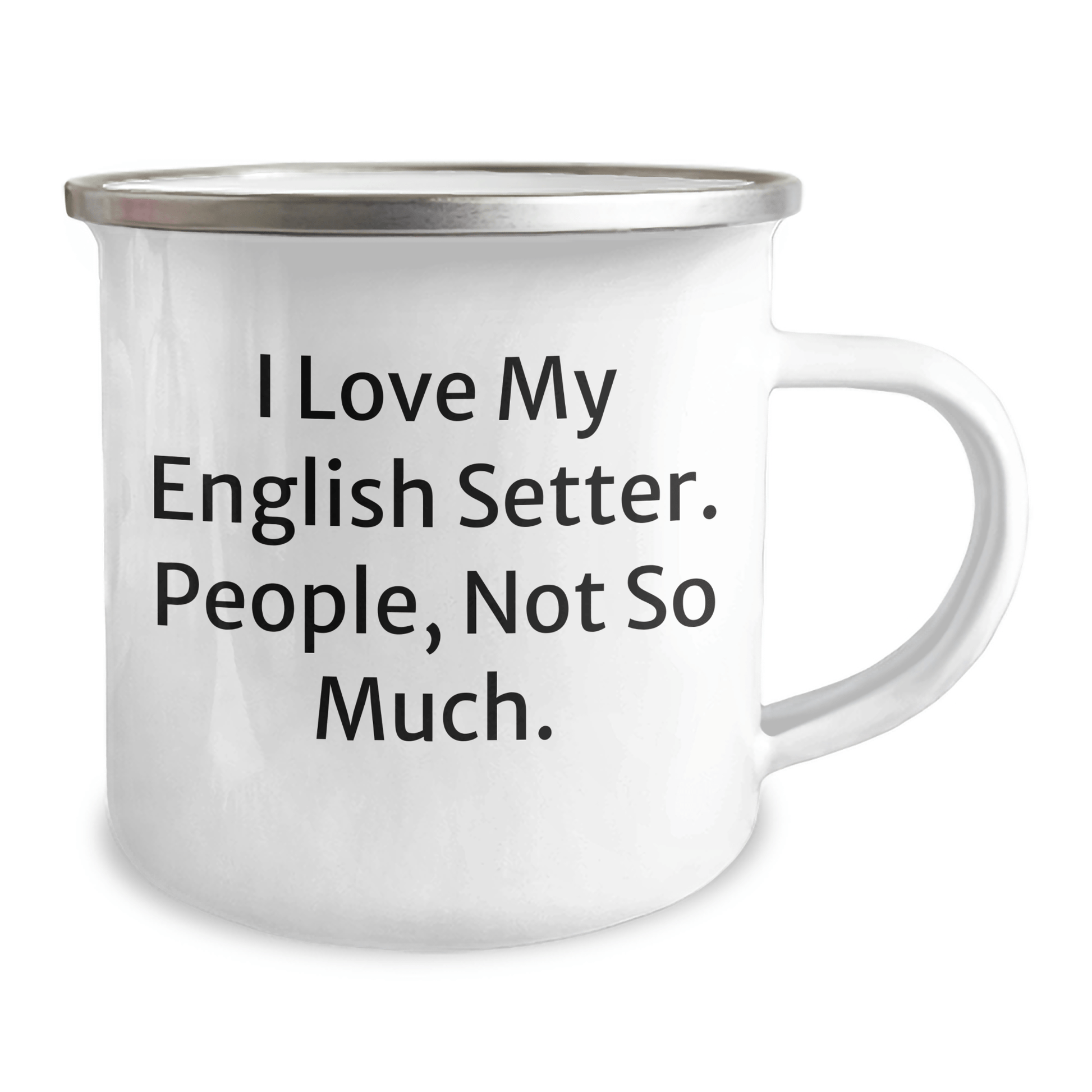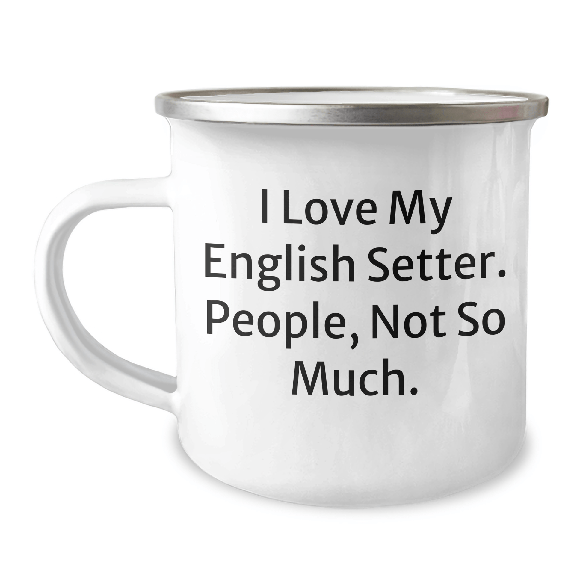 - Make the perfect cup of coffee or tea for your English Setter dog-loving dad on Father's Day with our camping mug, featuring a permanent quote that's sure to bring a smile: 'I Love My English Setter. People, Not So Much.' The stainless steel construction with enamel finish ensures durability and easy cleaning, making it perfect for outdoor adventures. With a 12 oz capacity, this camping mug is designed to keep your beverages hot or cold for hours.