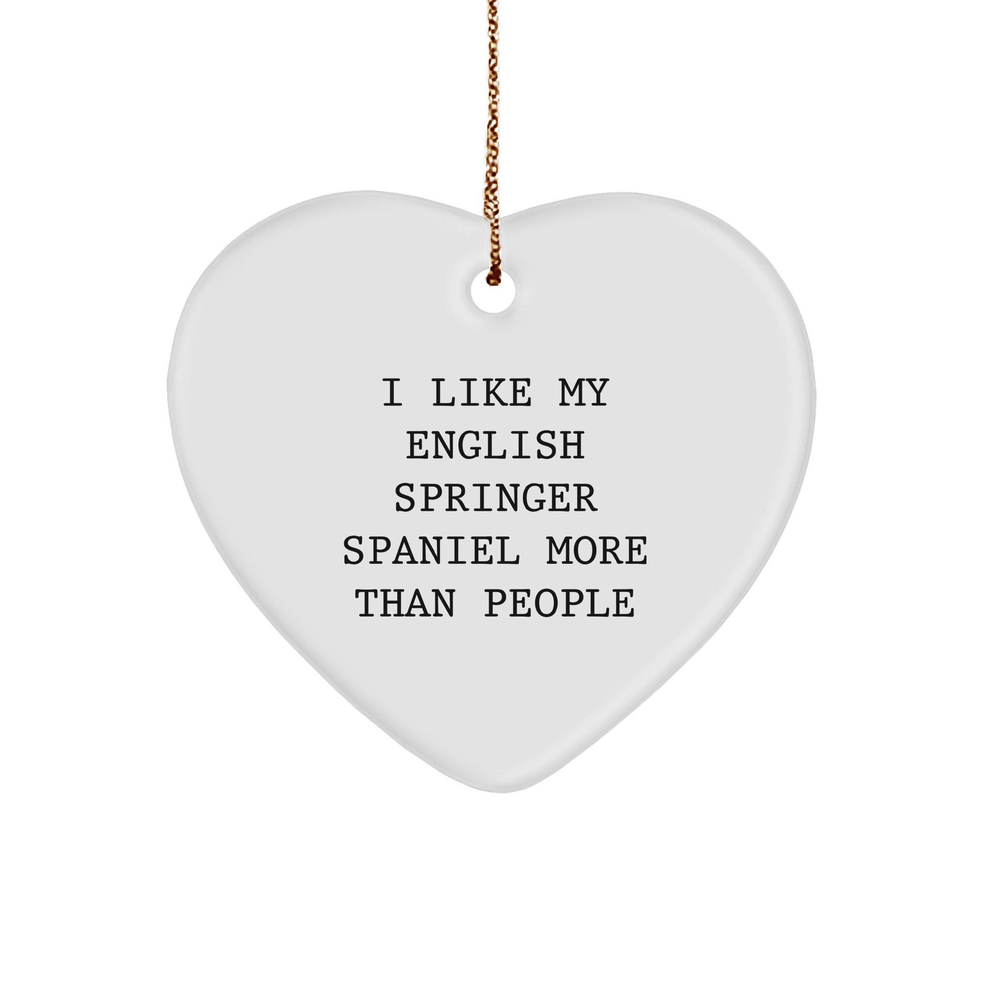 - This heart-shaped ornament features a funny quote that's sure to bring a smile to anyone's face. 'I Like My English Springer Spaniel More Than People' is a humorous and heartwarming sentiment that's perfect for the holiday season.