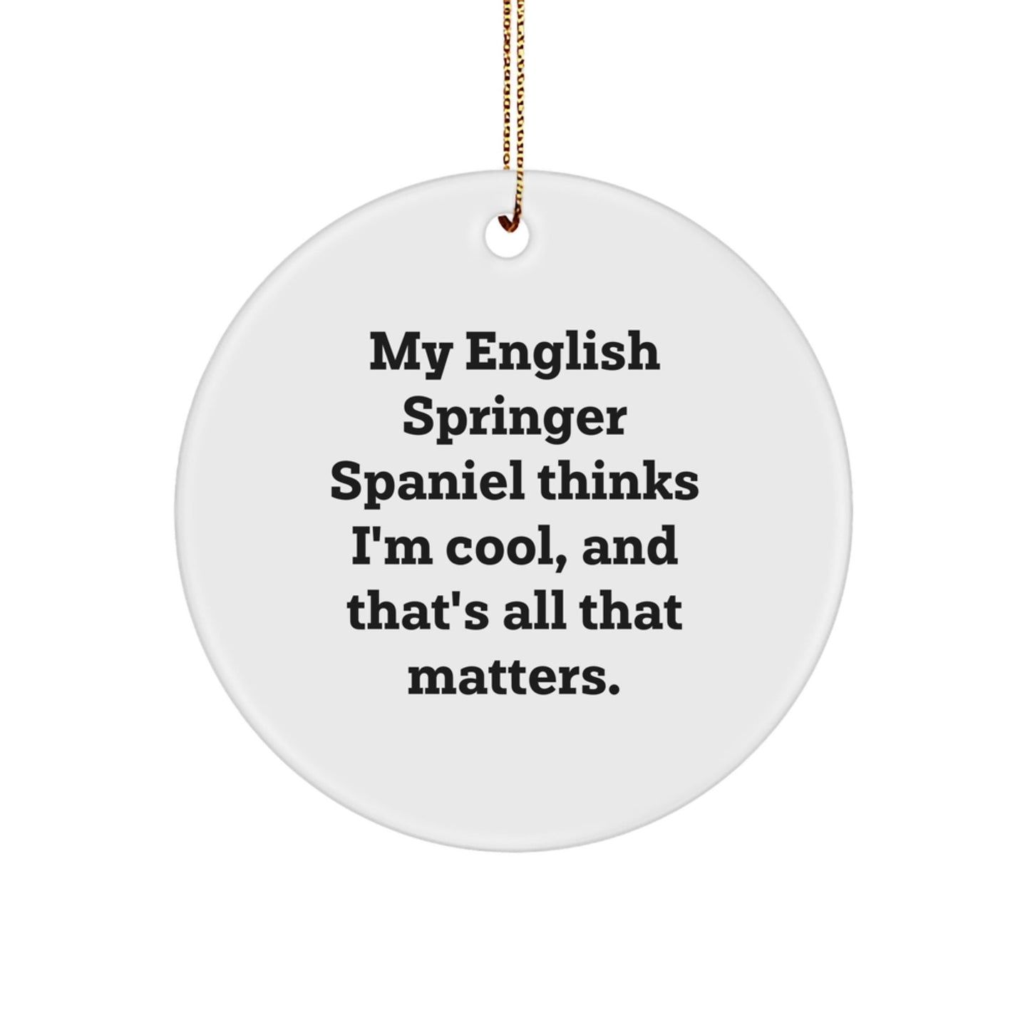 The quote 'My English Springer Spaniel Thinks I'm Cool, And That's All That Matters' is a funny and relatable way to express the special bond between humans and their pets. This ornament is a unique and thoughtful way to celebrate this special relationship and make a memorable holiday gift.