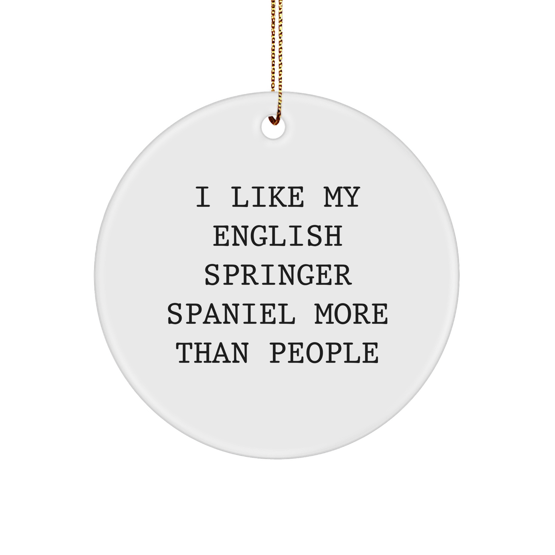 If you're an English Springer Spaniel Dog enthusiast, you'll love this funny quote circle ornament. The quote 'I Like My English Springer Spaniel More Than People' is sure to bring a smile to any dog lover's face. This ornament is a thoughtful gift for English Springer Spaniel Dog owners, making it a great addition to their Christmas decorations. The sturdy MDF material with high-gloss plastic finish ensures long-lasting designs, and the lightweight and resistant to breaking design makes it perfect for households with children or pets. Ships with a festive gold cord for easy hanging, making it a stress-free decorating experience.