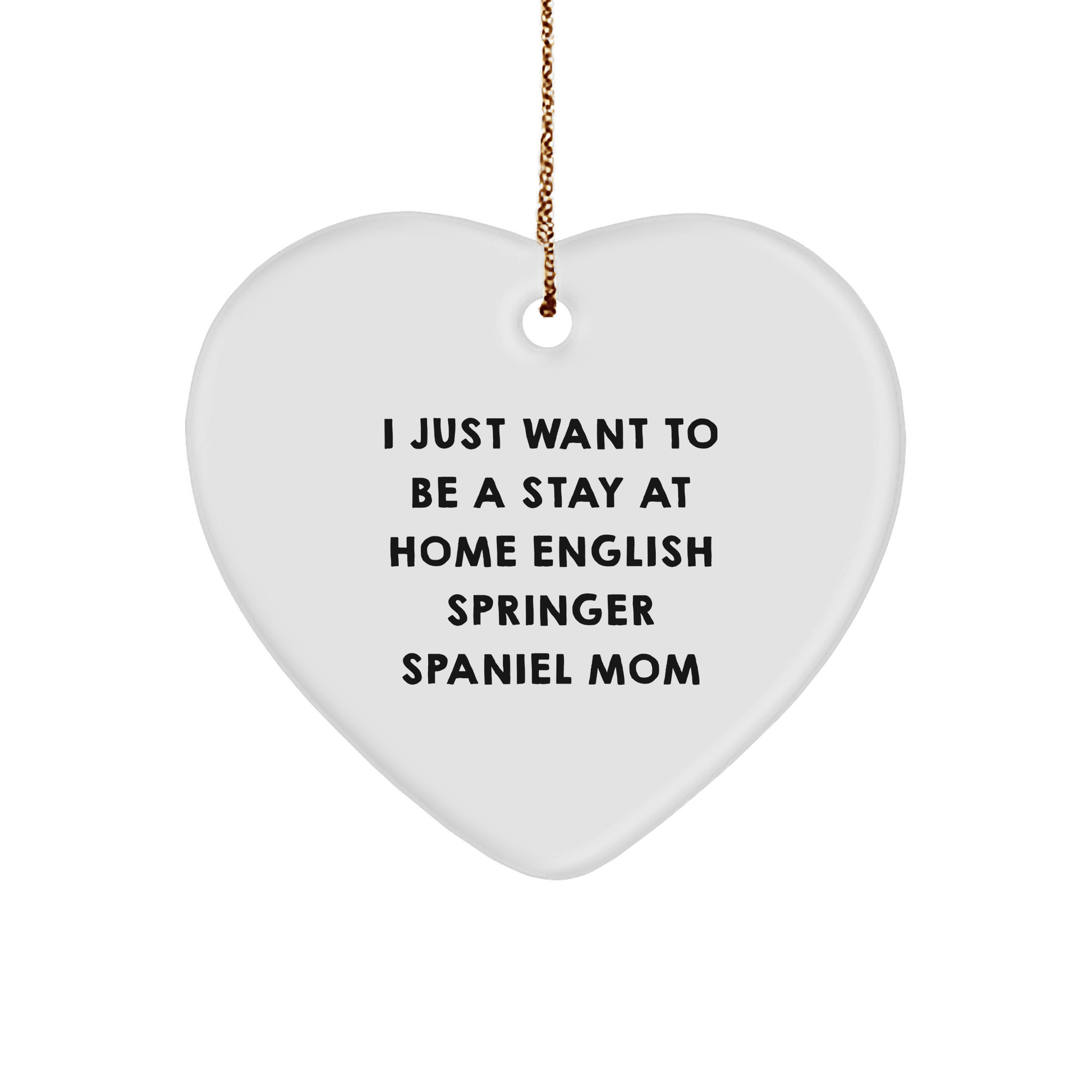 Are you an English Springer Spaniel Dog enthusiast or looking for a special gift for an English Springer Spaniel Dog mom? This funny 'I Just Want To Be A Stay At Home English Springer Spaniel Mom' heart ornament is the perfect choice! Made from sturdy MDF with a high-gloss plastic finish, it's lightweight, resistant to breaking, and vibrantly printed from edge-to-edge. The festive gold cord makes it easy to hang and stress-free decorating. Whether you're a family member or friend, this heartwarming gift will bring a smile to the English Springer Spaniel Dog mom's face. Get ready to spread some holiday cheer this Christmas with this delightful English Springer Spaniel Dog mom gift.