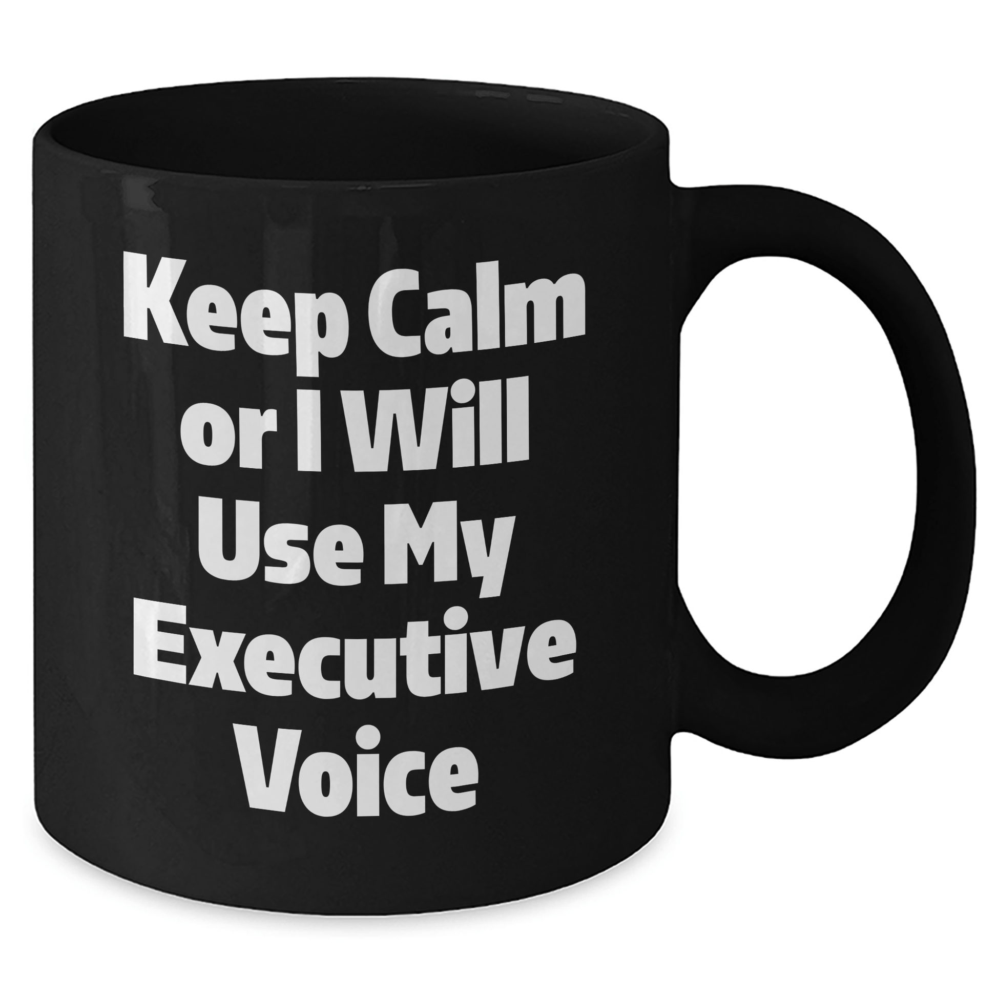 Treat yourself or a loved one to this unique and thoughtful gift today - it's the perfect way to celebrate a graduation or any other special occasion. As a keepsake or daily reminder, this Keep Calm Or I Will Use My Executive Voice black coffee mug is sure to be treasured for years to come.