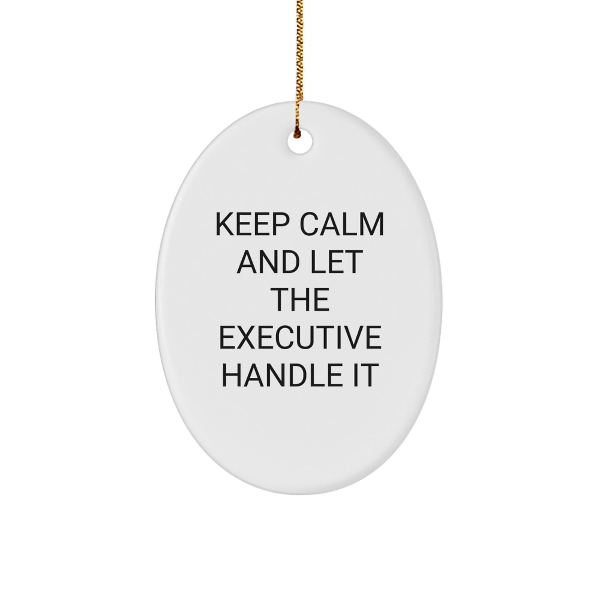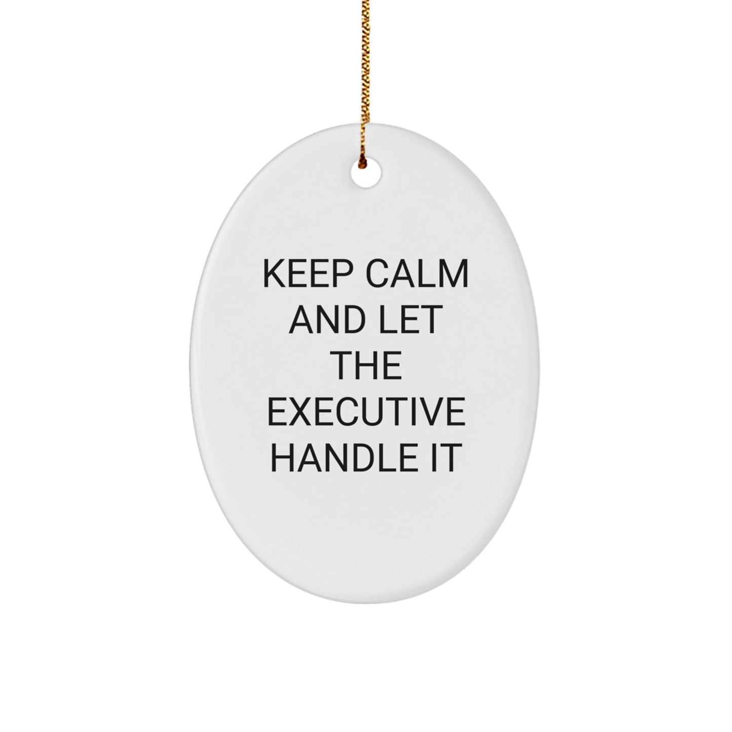 If you're looking for a thoughtful and humorous gift for your favorite executive, consider this Oval Ornament with the quote 'Keep Calm And Let The Executive Handle It'. Crafted from sturdy MDF with a high-gloss plastic finish, this ornament is lightweight and resistant to breaking, making it a great choice for households with children or pets. Whether you're a boss or an executive yourself, this ornament is a wonderful way to show off your sense of humor and camaraderie. You can give it as a gift to your colleagues, friends, or family members to brighten up their holiday season.