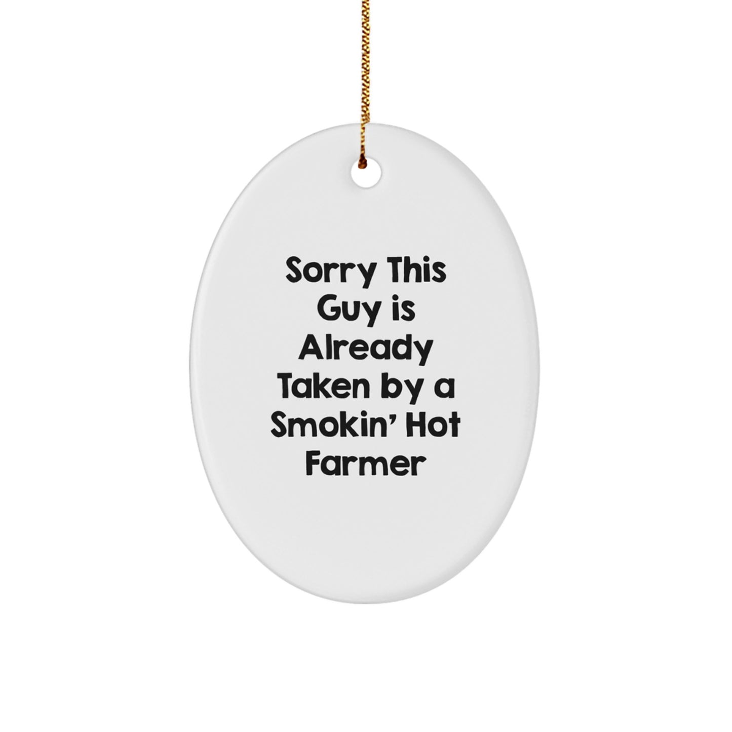 Get this unique gift for the farmer in your life, or keep it for yourself and enjoy the humor it brings. Whatever your reason, this Sorry This Guy Is Already Taken By A Smokin' Hot Farmer oval ornament is sure to be a hit!
