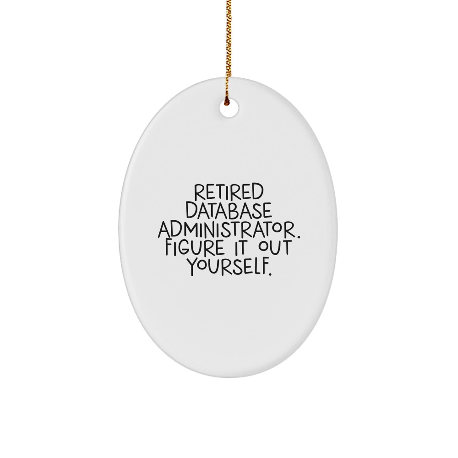 Are you looking for a unique gift for the Database Administrator in your life? Look no further! This oval ornament is a hilarious and thoughtful way to show your appreciation for their hard work. The quote 'Retired Database Administrator. Figure It Out Yourself.' is a funny and relatable way to poke fun at the struggles of being a database administrator. Whether you're a colleague, friend, or family member, this gift is sure to bring a smile to their face.