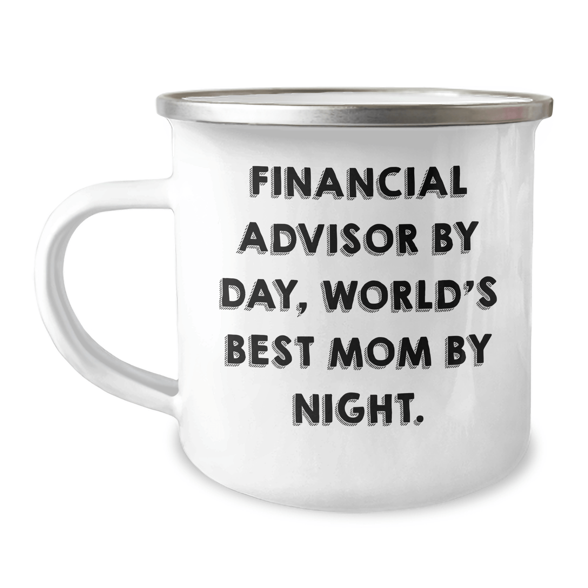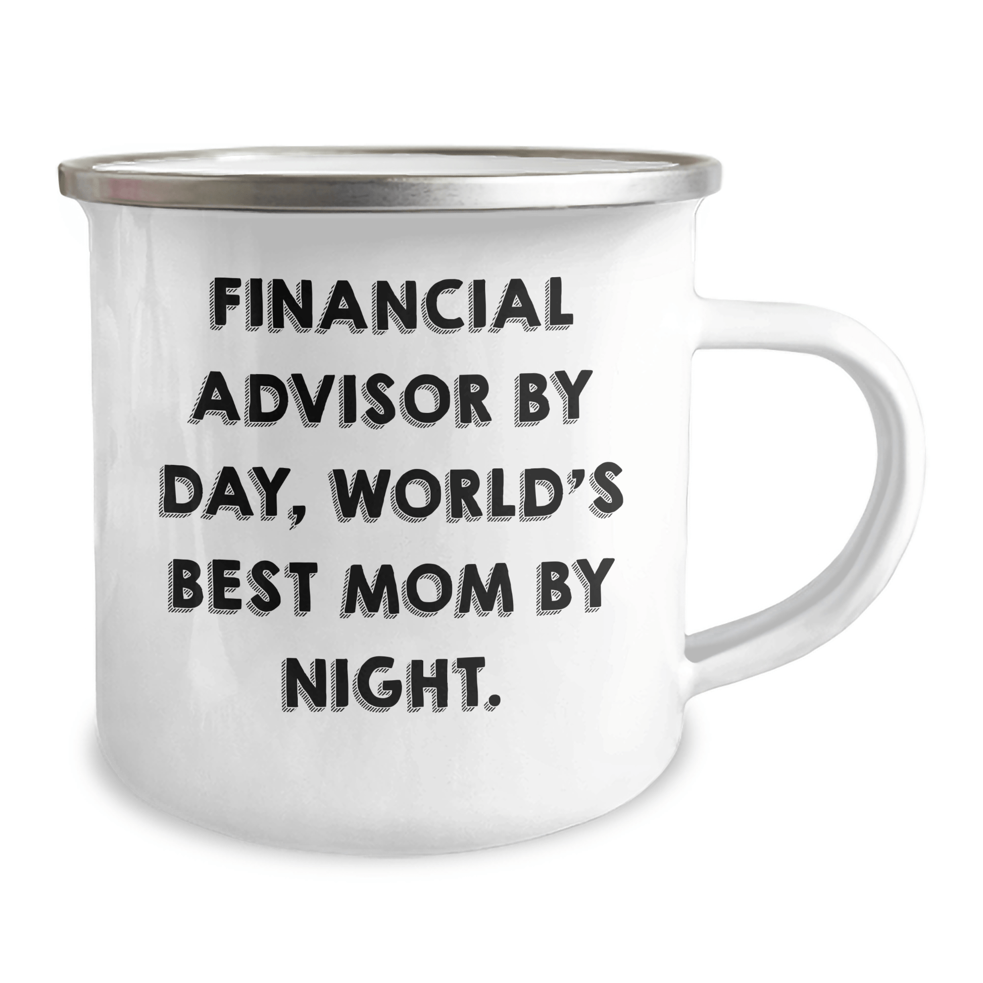 - As a financial advisor, you'll appreciate the thoughtful gift of this unique 'Financial Advisor By Day, World's Best Mom By Night.' camping mug, perfect for Father's Day. With a 12 oz capacity, stainless steel with enamel finish, and permanent printing that won't fade after washing, this mug is both practical and stylish. It's the perfect way to enjoy your morning coffee or tea while camping, hiking, or simply relaxing in the backyard.