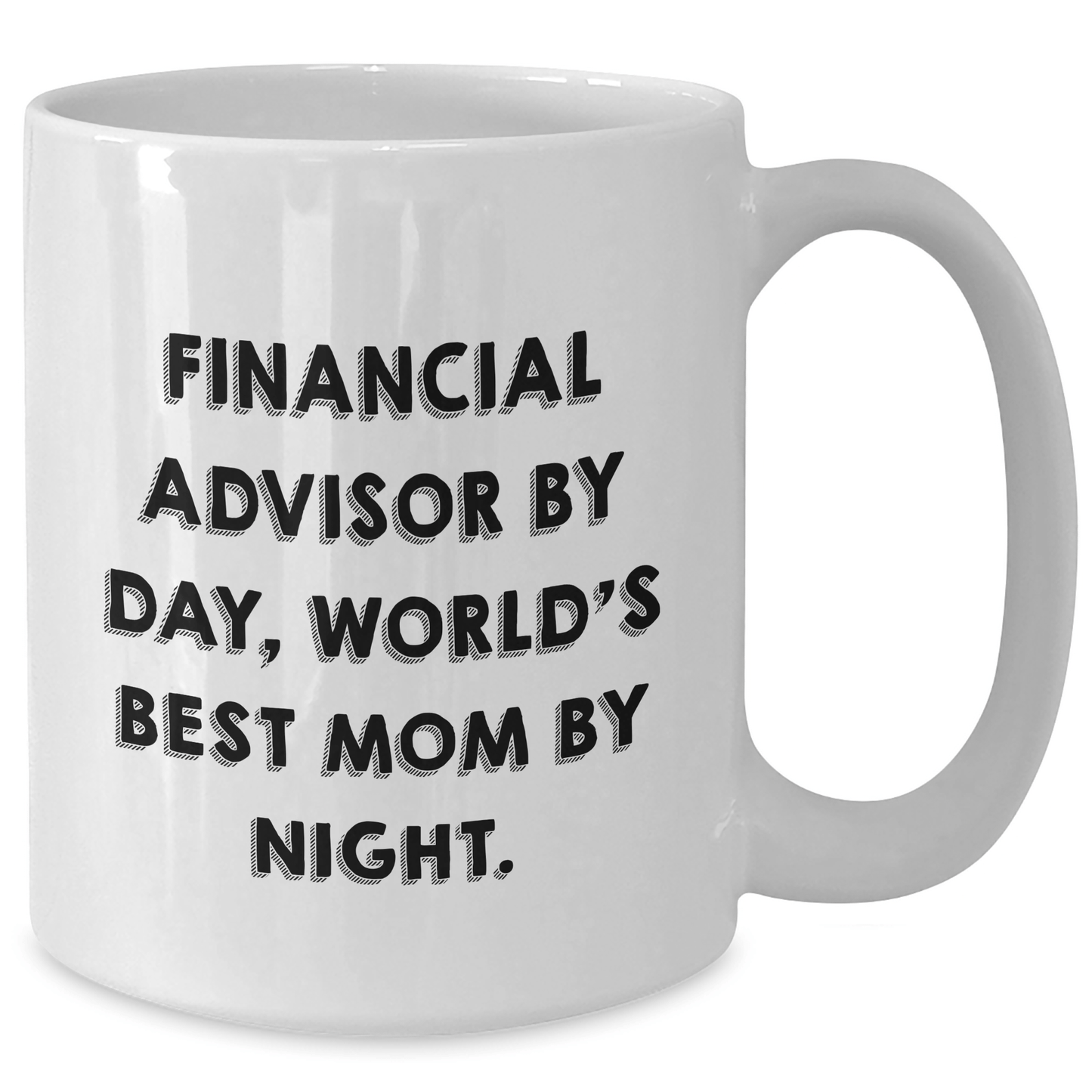 - The quote 'By Day, World's Best Mom By Night' is a unique and humorous way to celebrate the Financial Advisor's accomplishments and personality.