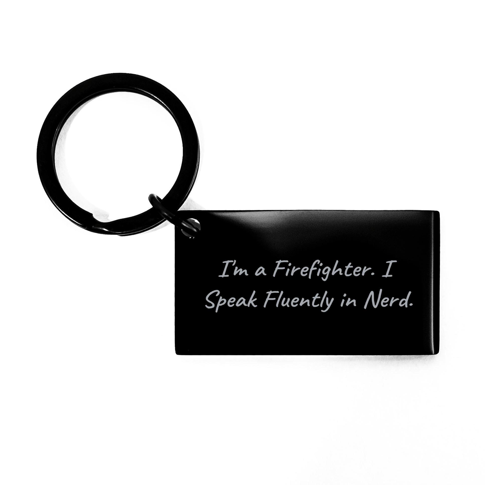 - The 'I'm A Firefighter. I Speak Fluently In Nerd.' keychain is a thoughtful gift for any firefighter, showcasing their unique profession and sense of humor. Made from sturdy stainless steel, this keychain is resistant to rust, corrosion, and discoloration, ensuring it remains a timeless symbol of their service. (199 characters)
