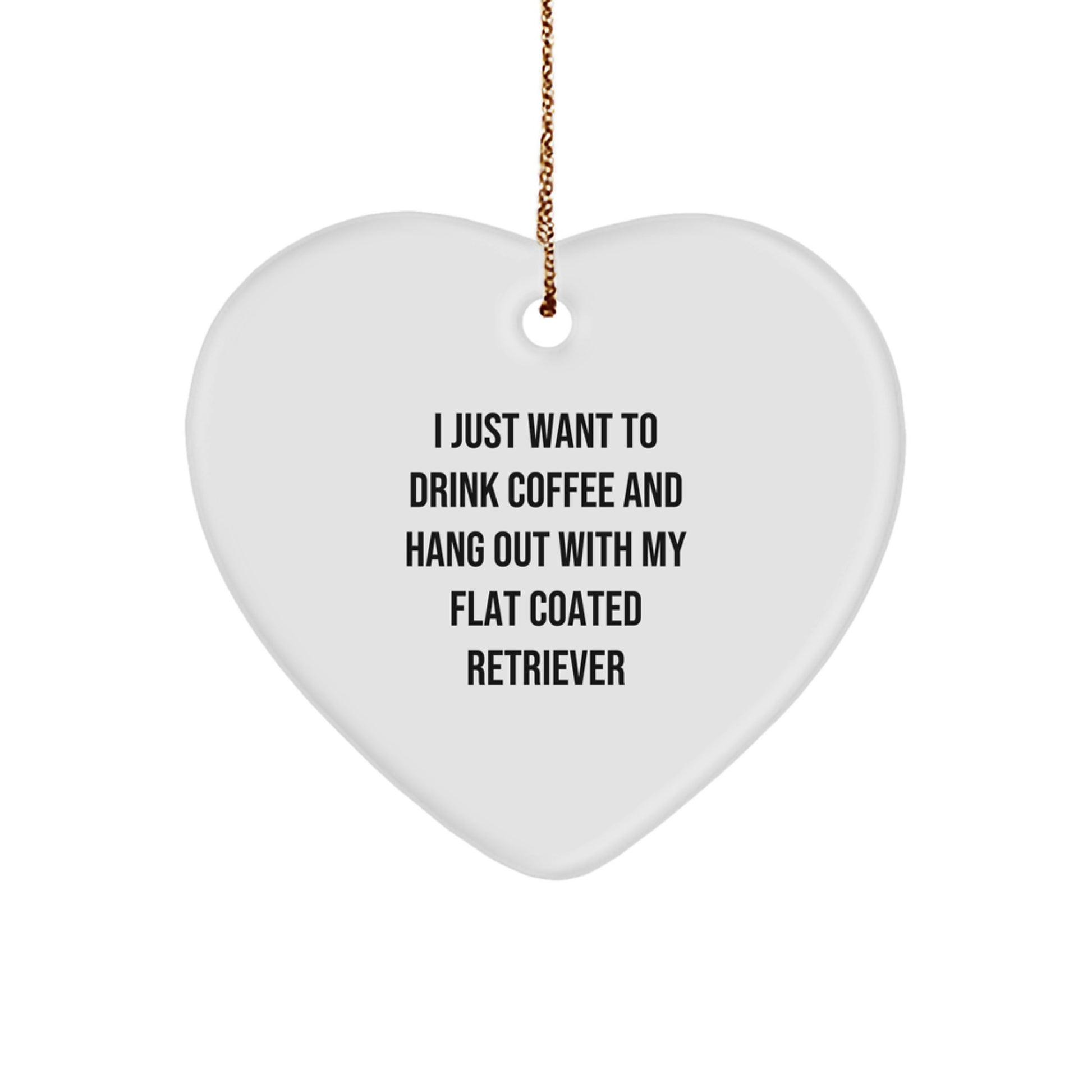 - Vibrant, sublimated print of the quote 'I Just Want to Drink Coffee and Hang Out with My Flat Coated Retriever' on a heart-shaped ornament