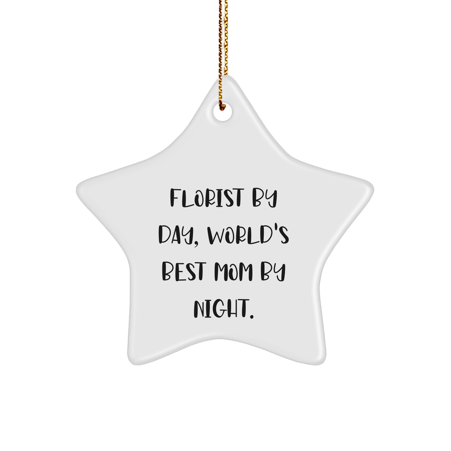 Are you a florist by day and a world's best mom by night? Show your creative side and your love for your family with this unique and funny star ornament! This beautifully crafted ornament is perfect for decorating your Christmas tree or giving as a gift to your favorite florist. Made from sturdy MDF with a high-gloss plastic finish, it's lightweight and resistant to breaking, making it a great choice for households with children or pets. The vibrant colors will add a pop of color to your holiday decor and make a thoughtful gift for your loved ones. Whether you're a florist or just a fan of flowers, this star ornament is sure to bring a smile to your face.