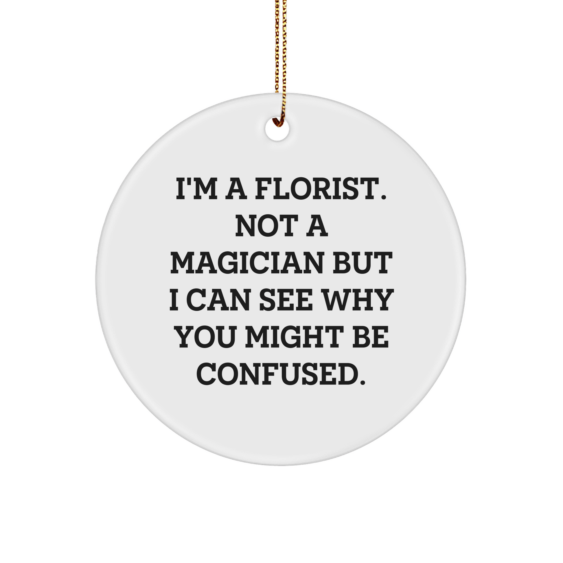 Are you searching for a unique gift for a florist or a unique ornament for your own home? Look no further! This Christmas Circle Ornament is a thoughtful and humorous gift that any florist would love. With its vibrant colors and festive gold cord, it's perfect for decorating your home or giving as a gift to a loved one. As a florist myself, I can attest that it's not magic that makes this ornament special, but the thought and care that goes into creating it. So, why not give the gift of a smile this Christmas season? Make it a thoughtful gift for your friends, family, or coworkers who appreciate the art of floristry. And, who knows, they might just see why you might be confused!