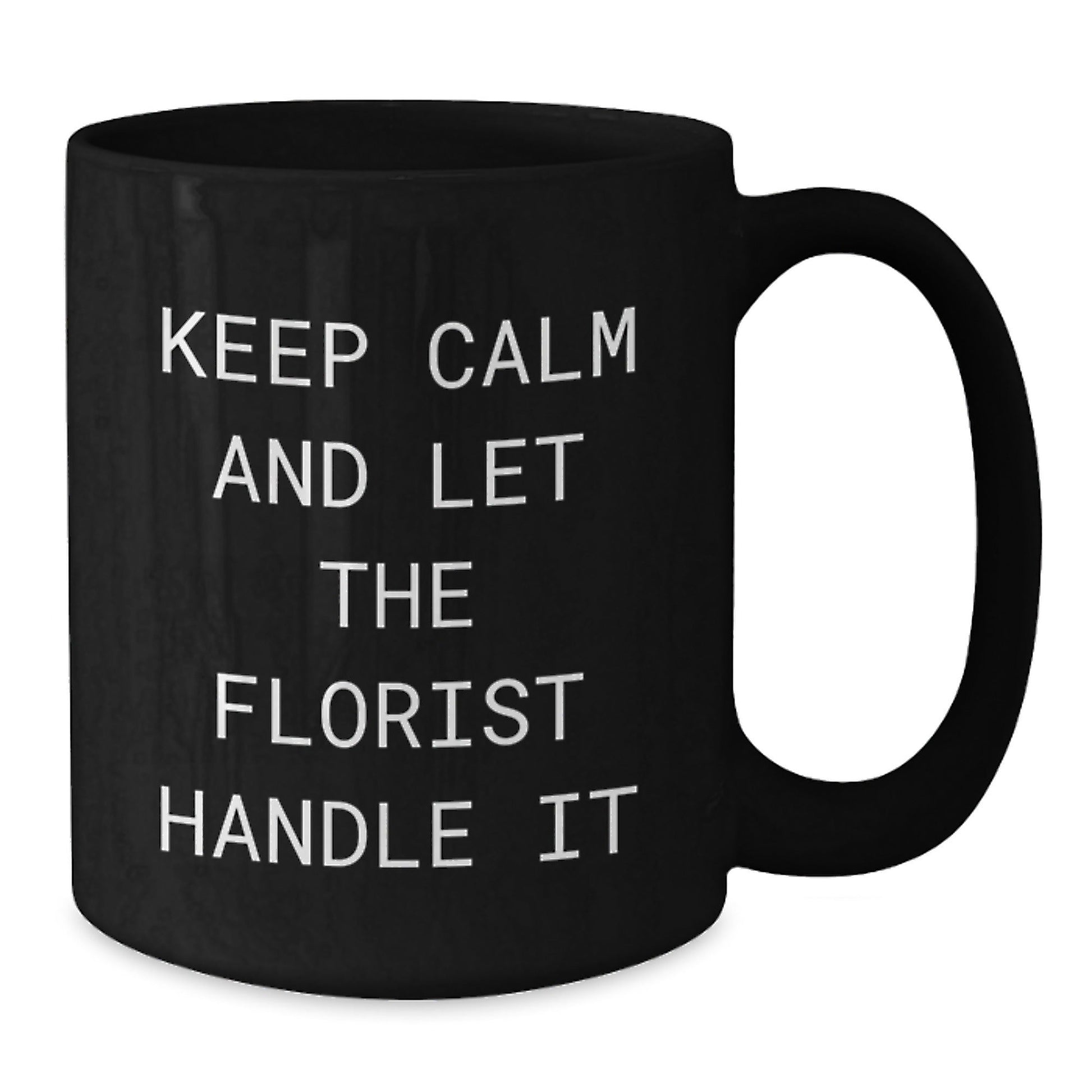 - The 'Keep Calm and Let the Florist Handle It' quote is printed in a bold and colorful design, making it stand out from other coffee mugs.