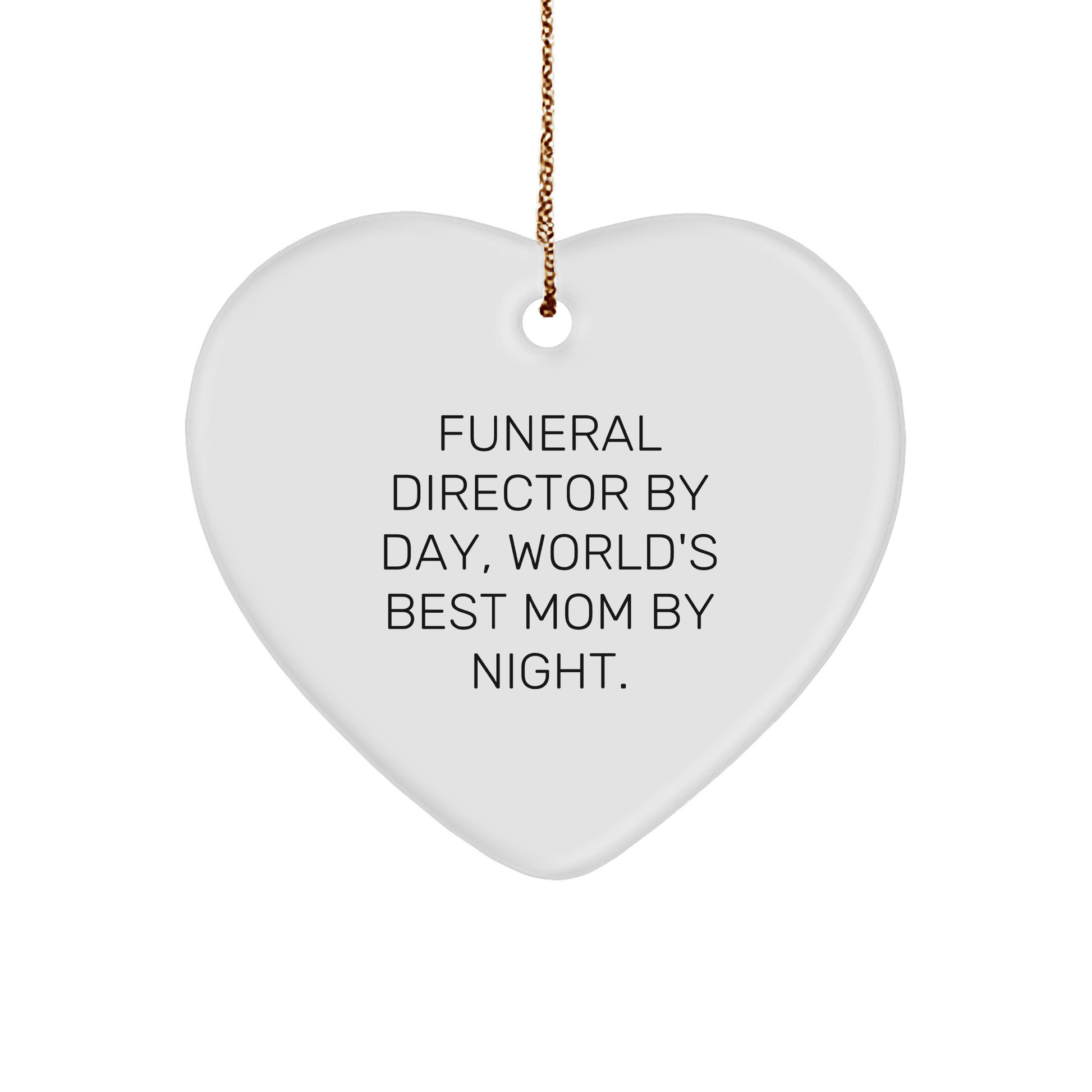 Looking for a thoughtful gift for the Funeral Director in your life? This Heart Ornament is the perfect way to show your appreciation for their hard work and dedication. With the quote 'Funeral Director By Day, World's Best Mom By Night.' printed on it, this gift is not only unique but also heartfelt. The Funeral Director will surely appreciate the thought and effort you put into choosing this special gift. Whether you're a friend, family member, or coworker, this gift is sure to bring a smile to their face. This Heart Ornament is crafted from sturdy MDF with a high-gloss plastic finish and vibrant colors, making it a beautiful addition to any room. It's lightweight and resistant to breaking, making it perfect for households with children or pets. Ships with a festive gold cord for easy hanging, perfect for stress-free decorating. This Christmas, give the gift that shows you care. Don't miss out and make it a holiday to remember!