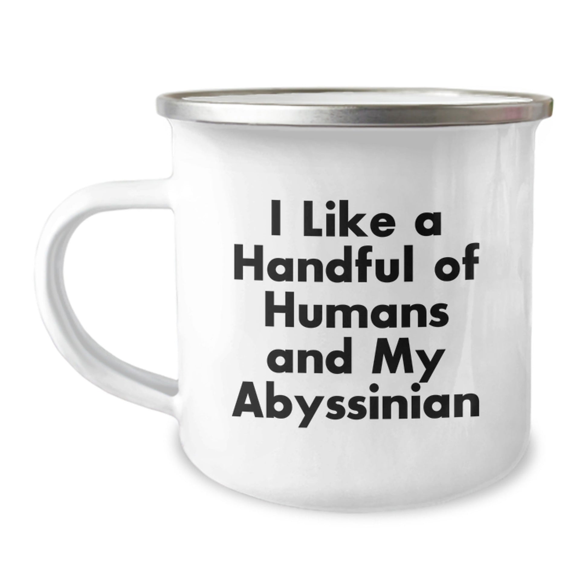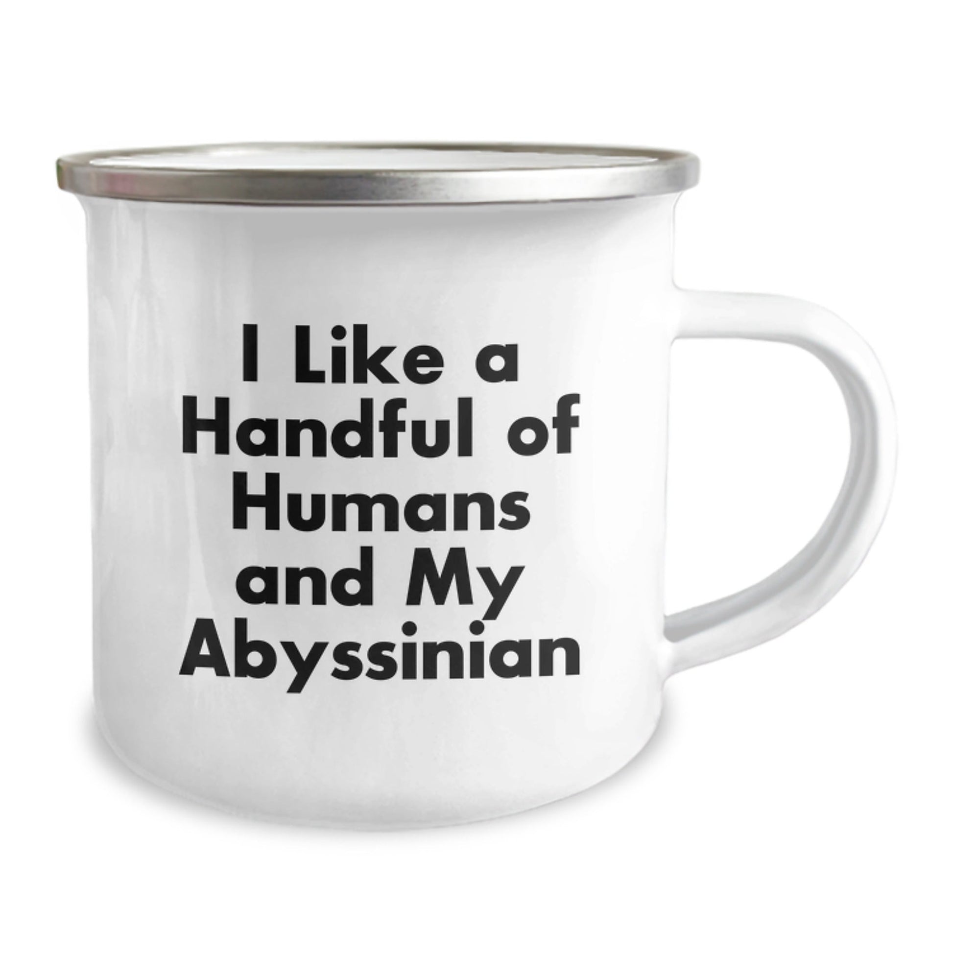 Are you an Abyssinian cat enthusiast or someone who loves unique gifts? This funny Abyssinian cat quote camping mug is perfect for you! The quote 'I Like A Handful Of Humans And My Abyssinian' is a humorous and relatable phrase that Abyssinian cat lovers will adore. This camping mug is a thoughtful gift for any occasion, including graduation. You can give it to your loved ones, friends, or family members who appreciate the quirky humor and adorable Abyssinian cat design. The mug is made of stainless steel with an enamel finish, ensuring it is sturdy and easy to clean. It has a 12 oz capacity, making it perfect for hot or cold beverages. The permanent printing will not fade even after multiple washes, making this mug a long-lasting and enjoyable gift.