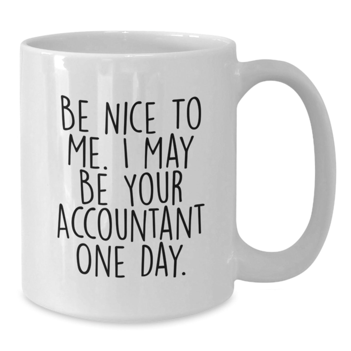 Are you looking for a unique gift for the accountant in your life? Look no further! This funny white coffee mug is the perfect way to show your appreciation for their hard work and dedication. The quote 'Be Nice To Me. I May Be Your Accountant One Day' is a humorous reminder that even accountants have their own quirks. The mug is made from high-quality ceramic and is safe for both microwave and dishwasher use. Whether you're a friend, family member, or coworker, this gift is sure to bring a smile to their face. So why not show your accountant that you care with this thoughtful and funny gift?