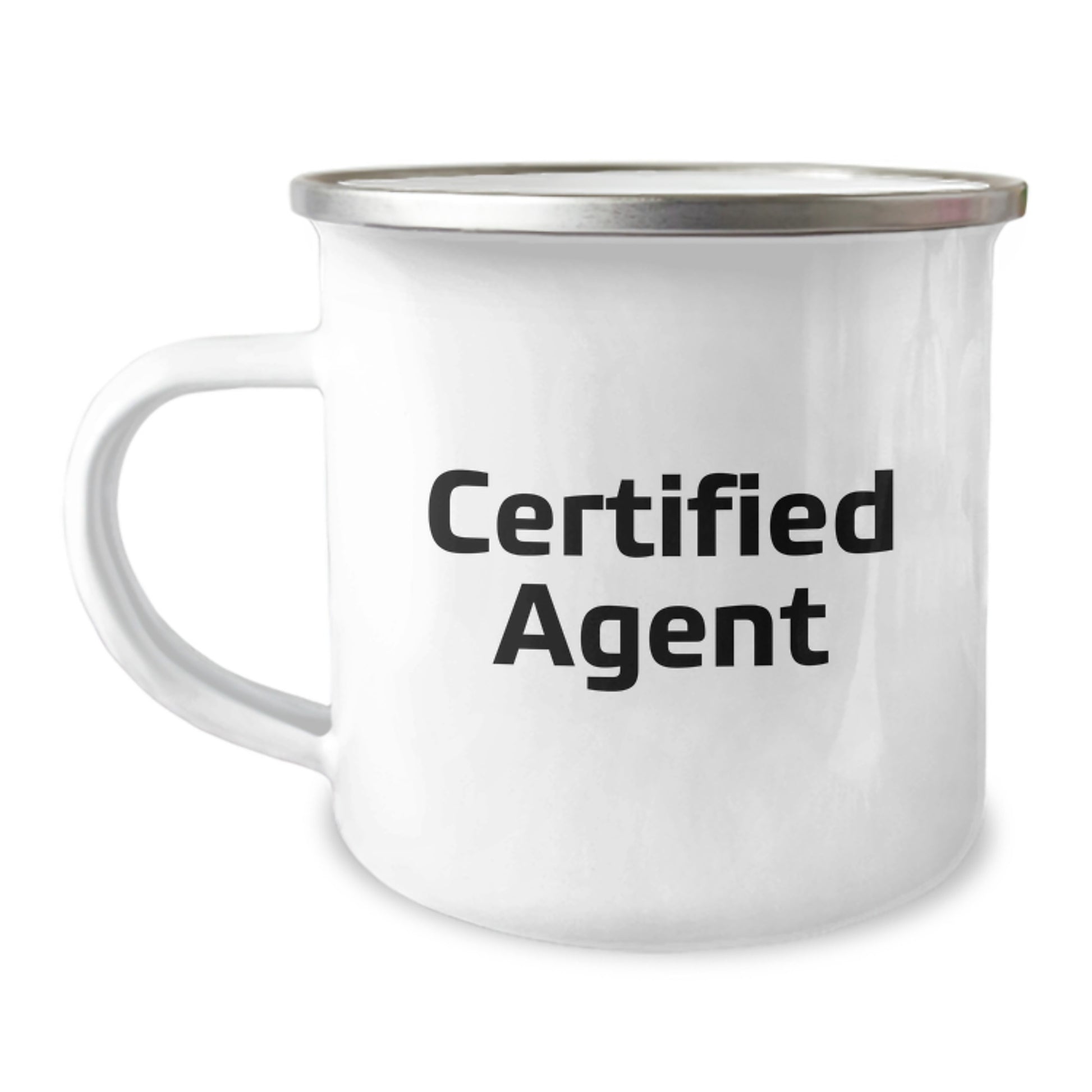 - Perfect for the 'Certified Agent' in your life, this camping mug is designed for the great outdoors. With a 12 oz capacity, stainless steel with enamel finish, and permanent printing that won't fade after washing, you can enjoy your favorite beverage with confidence. Whether you're celebrating a graduation or just enjoying a camping trip, this agent camping mug is the perfect way to show off your personality and style.