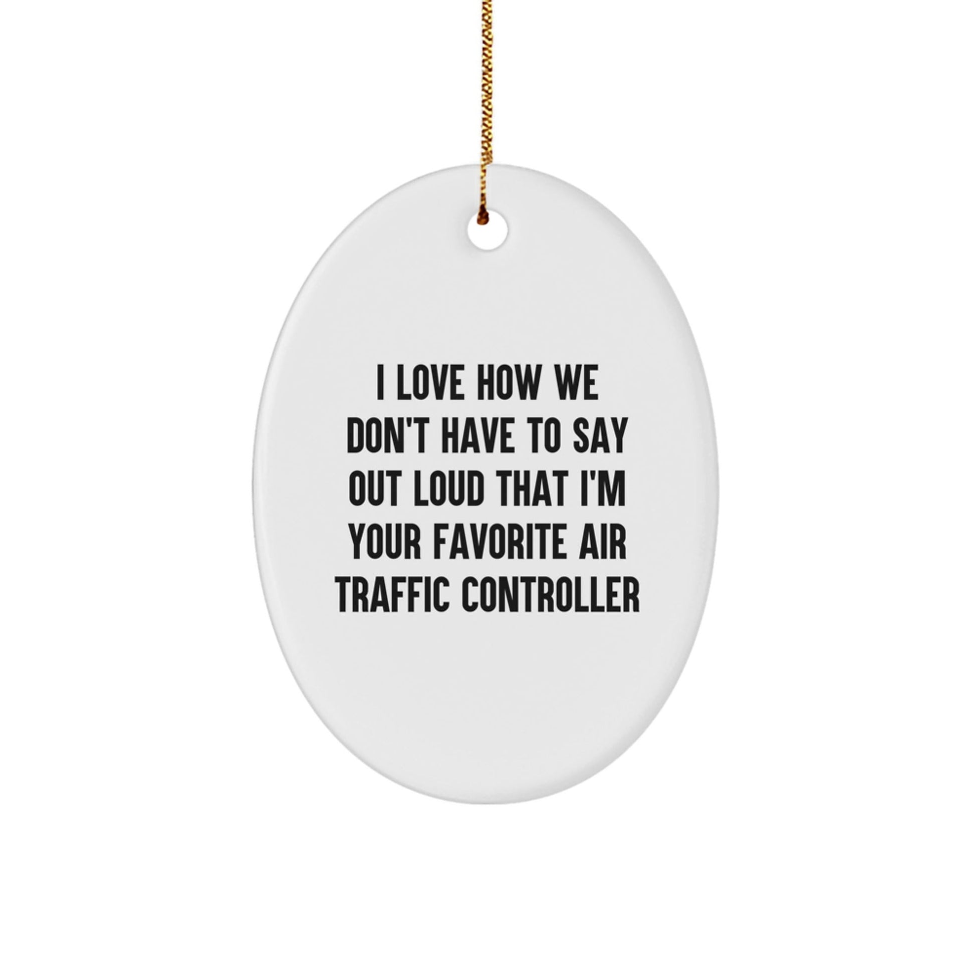 A unique gift for the Air Traffic Controller in your life! This funny oval ornament says it all: 'I Love How We Don't Have To Say Out Loud That I'm Your Favorite Air Traffic Controller'.