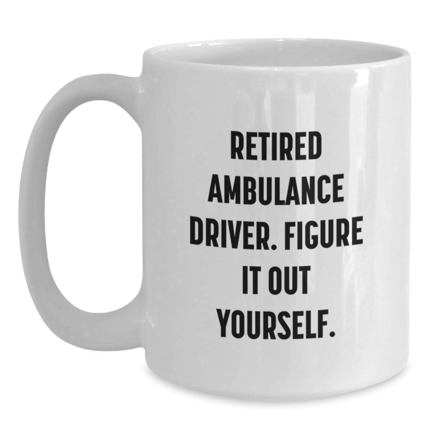 Get ready to ignite the passion of ambulance drivers with this unique white coffee mug! As a retired ambulance driver would say, 'Figure It Out Yourself' - and that's exactly what this mug does. Perfect for ambulance driver enthusiasts, this 11oz or 15oz ceramic mug is made from high-quality ceramic, making it microwave and dishwasher safe. It's the ideal gift for ambulance drivers, whether it's for a graduation or just a token of appreciation. Share your love and admiration for these brave men and women with this humorous quote that is sure to bring a smile to their faces. Give the gift of laughter and appreciation with this Ambulance Driver White Coffee Mug.